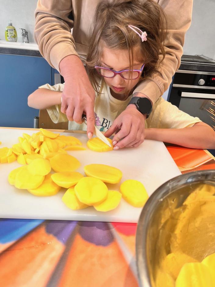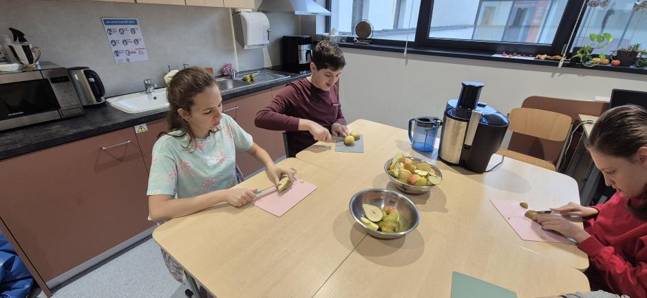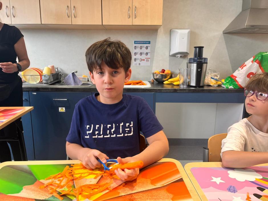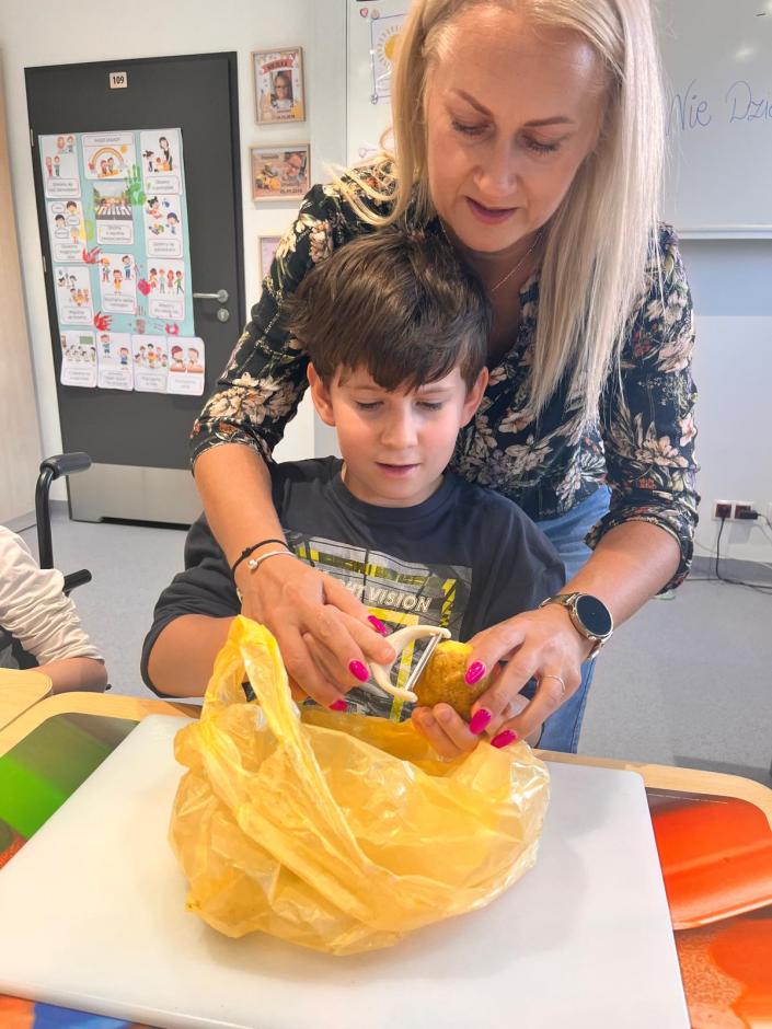 Celem zajęć było utrwalenie wiadomości dotyczących sezonowych warzyw i owoców, ich przechowywania, wartości odżywczych, obróbki termicznej, a także utrwalenie zasad bhp podczas przygotowywania posiłków.