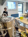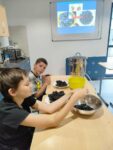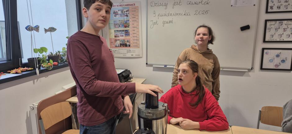 Podczas zajęć uczniowie wykorzystali deski, noże, garnki, talerze , sztućce, blender, patelnie otrzymane w ramach programu # Laboratorium Przyszłości#
