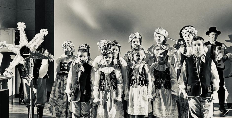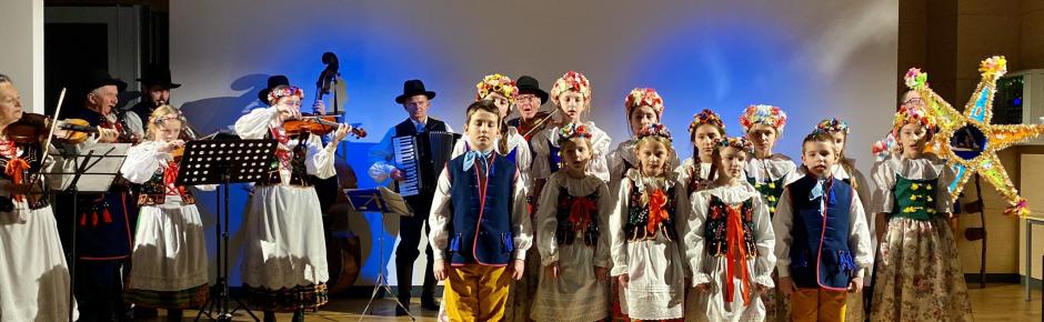 W dniu 11 stycznia mieliśmy zaszczyt gościć grupę dziecięcą Ludowego Zespołu Pieśni i Tańca „Andrychów” z Andrychowa. Kolędnicy z gwiazdą i w strojach ludowych naszego regionu przy akompaniamencie kapeli, zaprezentowali tradycyjne kolędy i pastorałki. Goście przywieźli ze sobą „wakat”- ludowy instrument perkusyjny z charakterystyczną główką diabełka na górze, którym to według starych wierzeń odpędza się wszystko co złe w domostwach odwiedzanych przez kolędników.