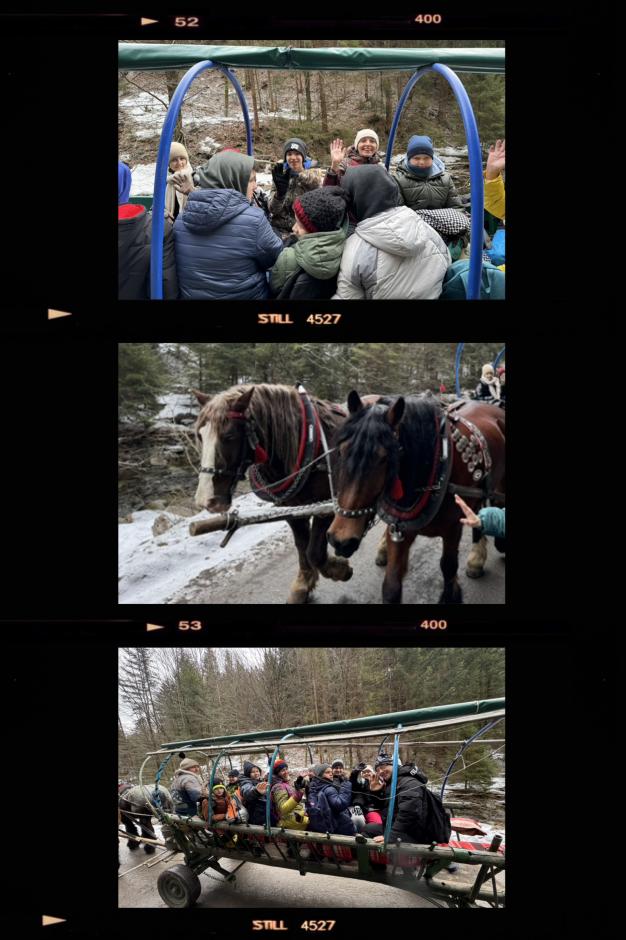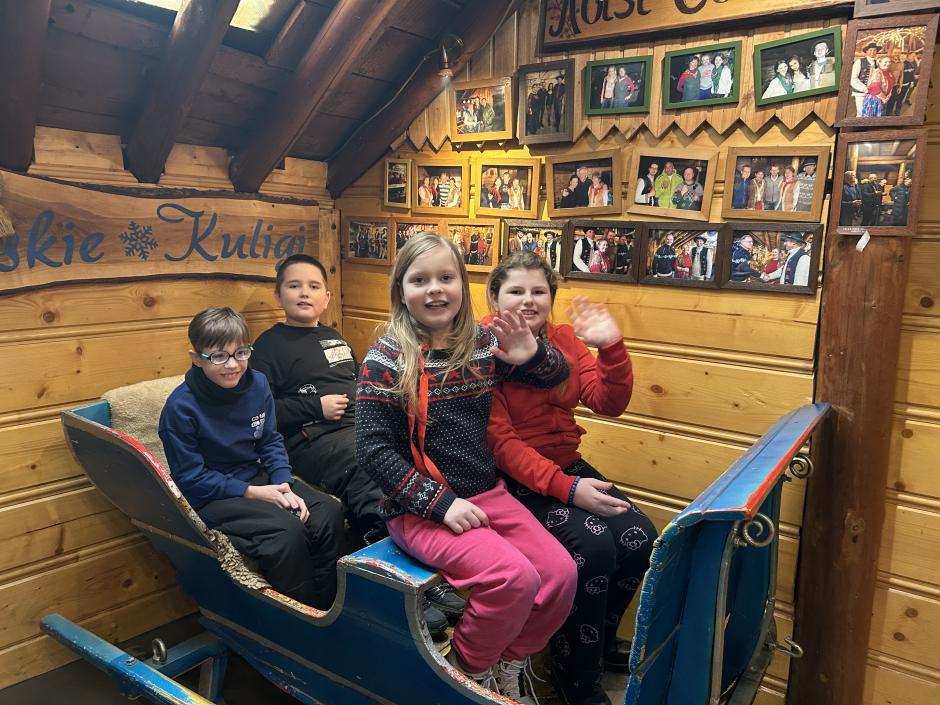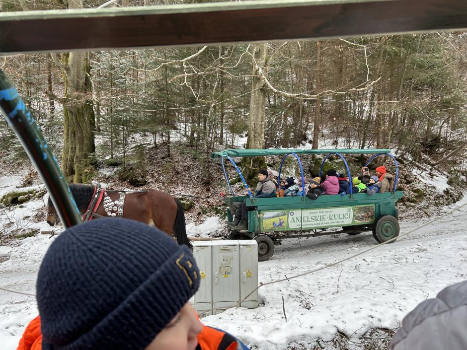 Podczas kuligu jechaliśmy bryczkami na kołach, podziwiając malowniczą zimową przyrodę. Gdy konie ciągnęły nasze bryczki słyszeliśmy piękne dźwięczenie dzwoneczków i prowadziliśmy ze sobą radosne rozmowy, ciesząc się wspólnie spędzonym czasem.