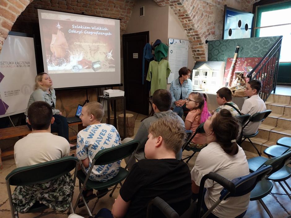 To już ostatnie zajęcia z cyklu „Bez szkolnej ławy”, w których uczestniczyli uczniowie klas 5c i 6d. Tym razem wybraliśmy się „Szlakiem wielkich odkryć geograficznych” do Australii. Zapoznaliśmy się z tradycją i kulturą odległego kontynentu oraz wykonaliśmy prace stemplując wzory etniczne. Przed nami wakacyjny czas, ale już nie możemy się doczekać kolejnych zajęć na Zamku i wypraw w nieznane…
