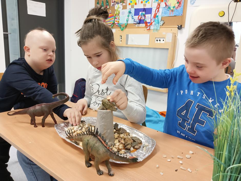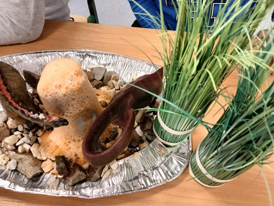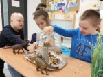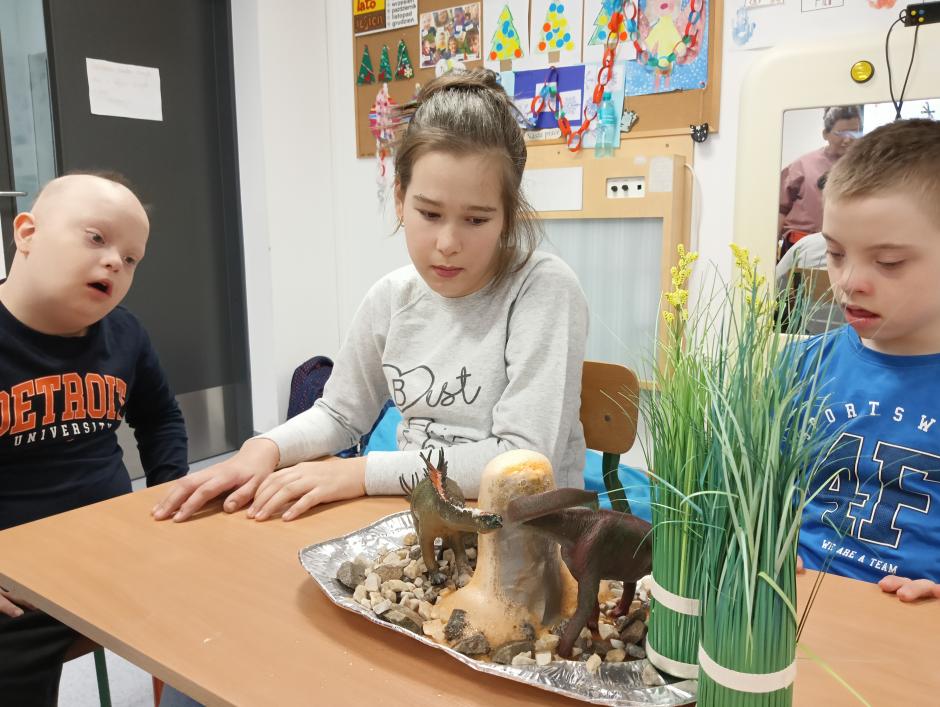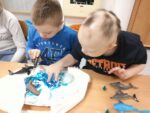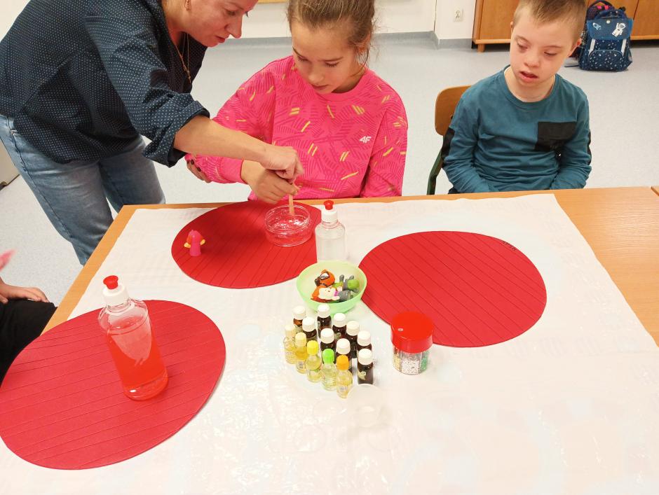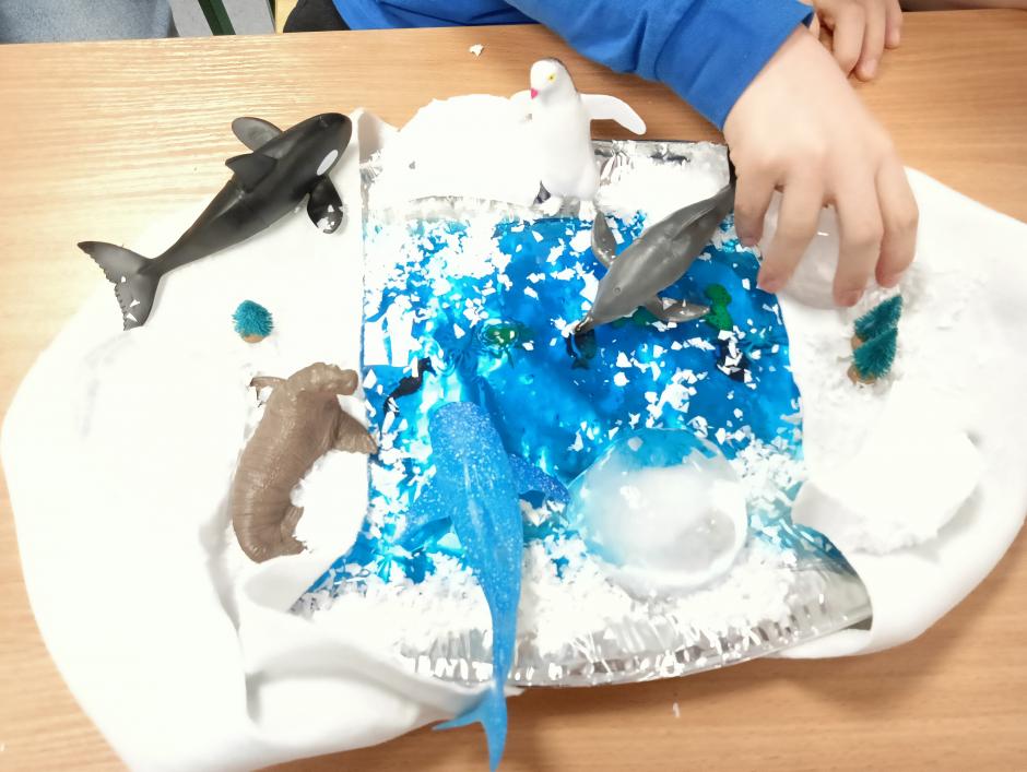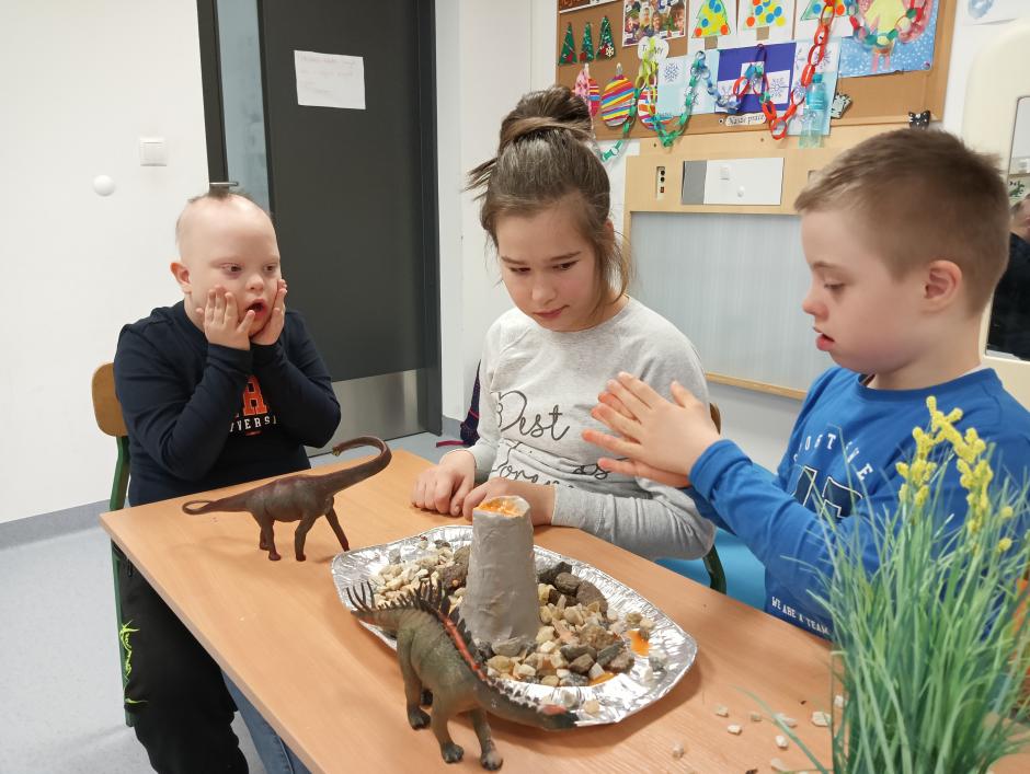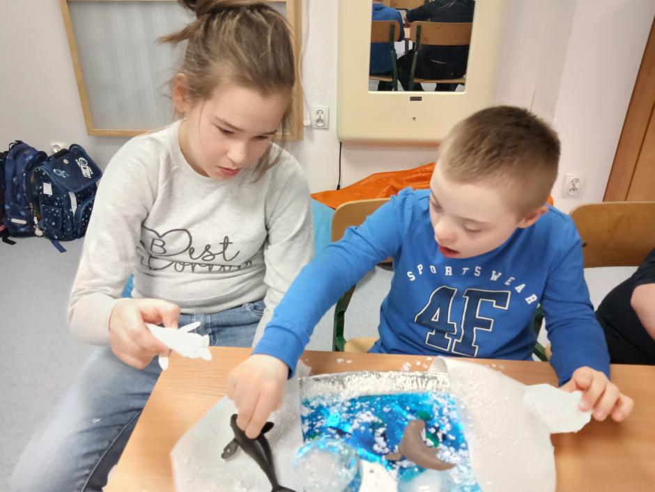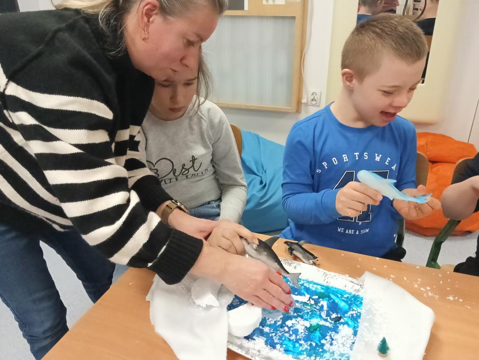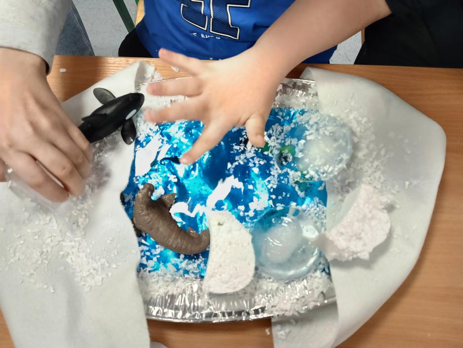 w płynie, aktywatora i brokatów. „Ciepło – zimno” to temat kolejnej aktywności sensorycznej. Uczniowie skonstruowali wyjątkowe makiety przedstawiające Krainę Wulkanu oraz Krainę Wiecznej Zimy. Wulkan powstał z gliny, a podłoże z kamieni o rożnej wielkości i fakturze. Wychowawca korzystając z sody oczyszczonej, octu i barwnika spożywczego przeprowadził eksperyment „wybuch wulkanu”, który bardzo spodobał się uczniom. W krainie zimna dominowały kryształy lodu, puszysty śnieg oraz zwierzęta morskie.