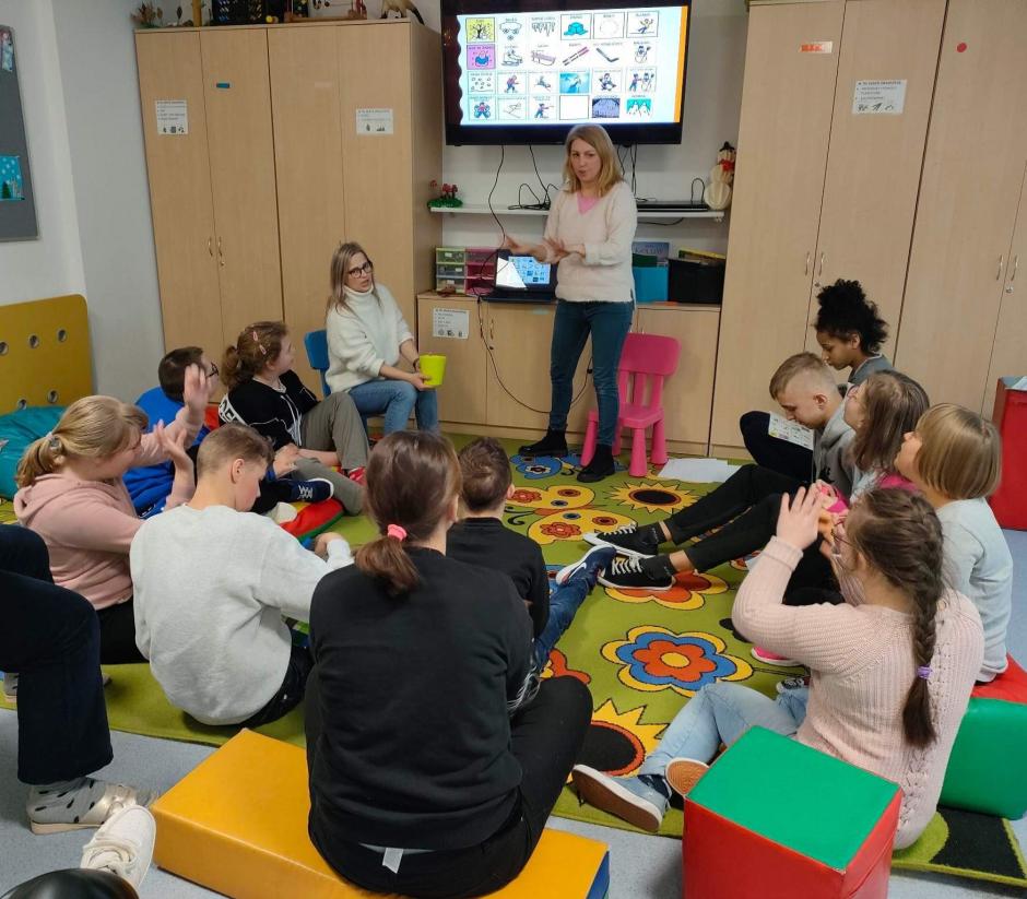 W dniu 18.01.2023r. w naszej szkole odbyło się kolejne spotkanie z cyklu „4 pory roku z AAC”, tym razem poświęcone zimie i zimowym aktywnościom. Uczniowie mogli porozmawiać o obecnej porze roku i jej urokach, a także utrwalić słownictwo związane z czasem i kalendarzem. Podczas zajęć powstał „urodzinowy kalendarz”. Nie zabrakło wspólnych zabaw językowych i ruchowych. Zwieńczeniem była zimowa bitwa na papierowe śnieżki, która dostarczyła nam mnóstwo radości. Pełni dobrej energii i optymizmu czekamy na kolejne spotkanie, które już wkrótce…