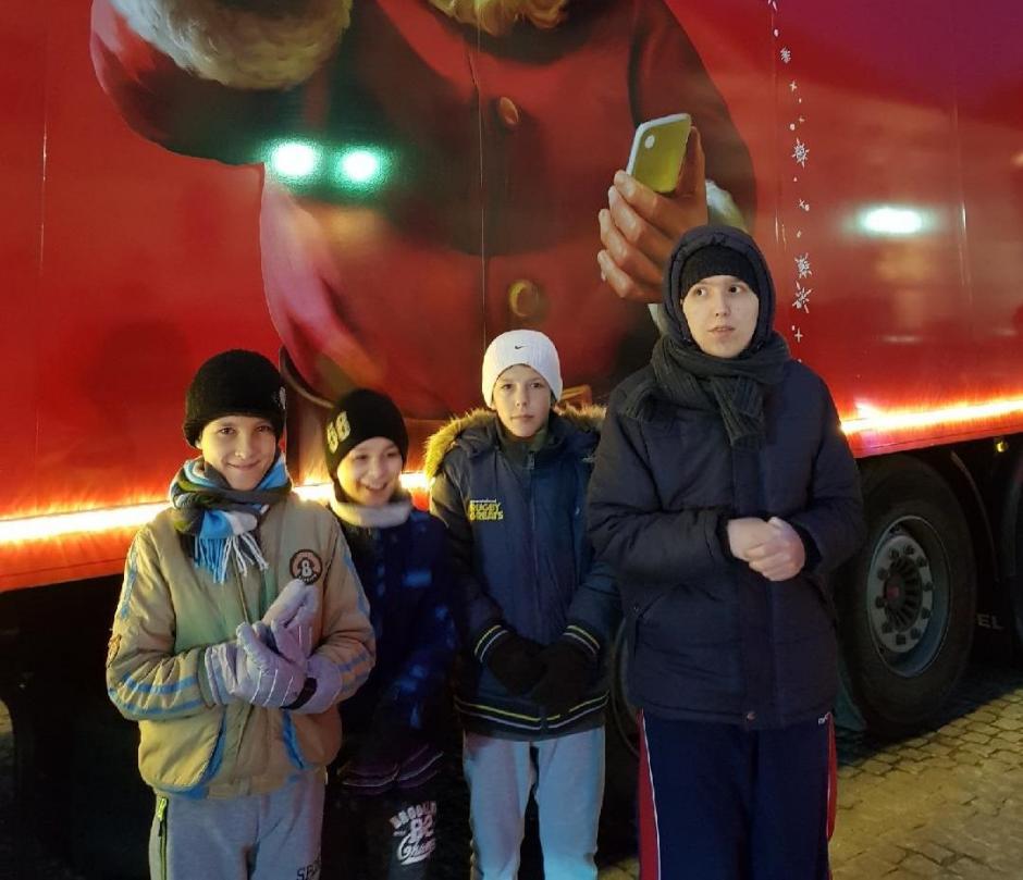 W dniu 19 grudnia w centrum naszego miasta pojawiła się, znana wszystkim z reklam telewizyjnych, ciężarówka Coca- Coli. Nie mogło nas tam zabraknąć, więc pod opieką p. pedagog S. Magiery i p. S. Ćwiękały wyruszyliśmy na Rynek. Czekała tam na nas wielka ciężarówka, a w niej baśniowy pokój ze Świętym Mikołajem, wirtualne sanie oraz gry, zabawy, konkursy i oczywiście Coca- Cola.