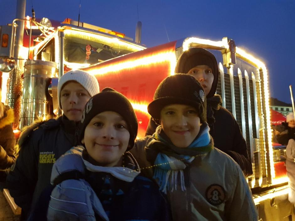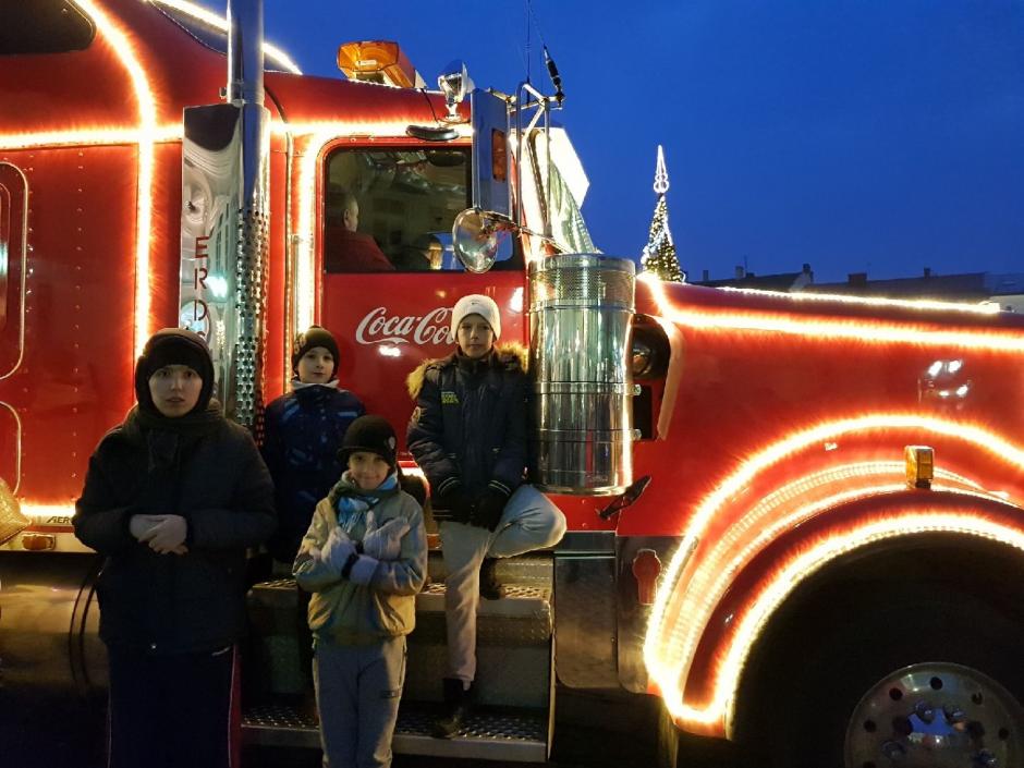 W dniu 19 grudnia w centrum naszego miasta pojawiła się, znana wszystkim z reklam telewizyjnych, ciężarówka Coca- Coli. Nie mogło nas tam zabraknąć, więc pod opieką p. pedagog S. Magiery i p. S. Ćwiękały wyruszyliśmy na Rynek. Czekała tam na nas wielka ciężarówka, a w niej baśniowy pokój ze Świętym Mikołajem, wirtualne sanie oraz gry, zabawy, konkursy i oczywiście Coca- Cola.