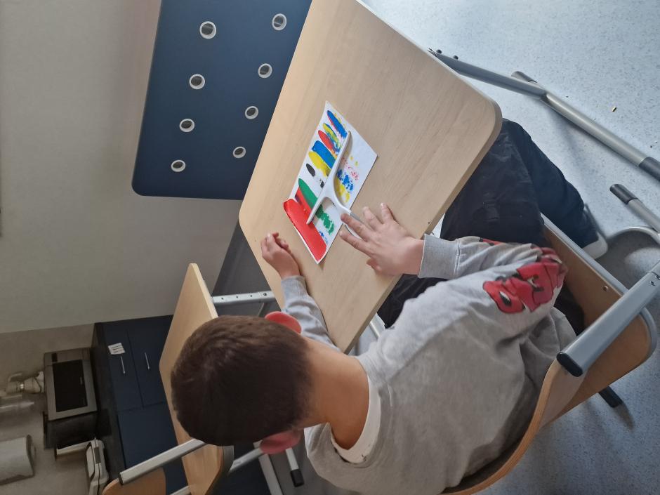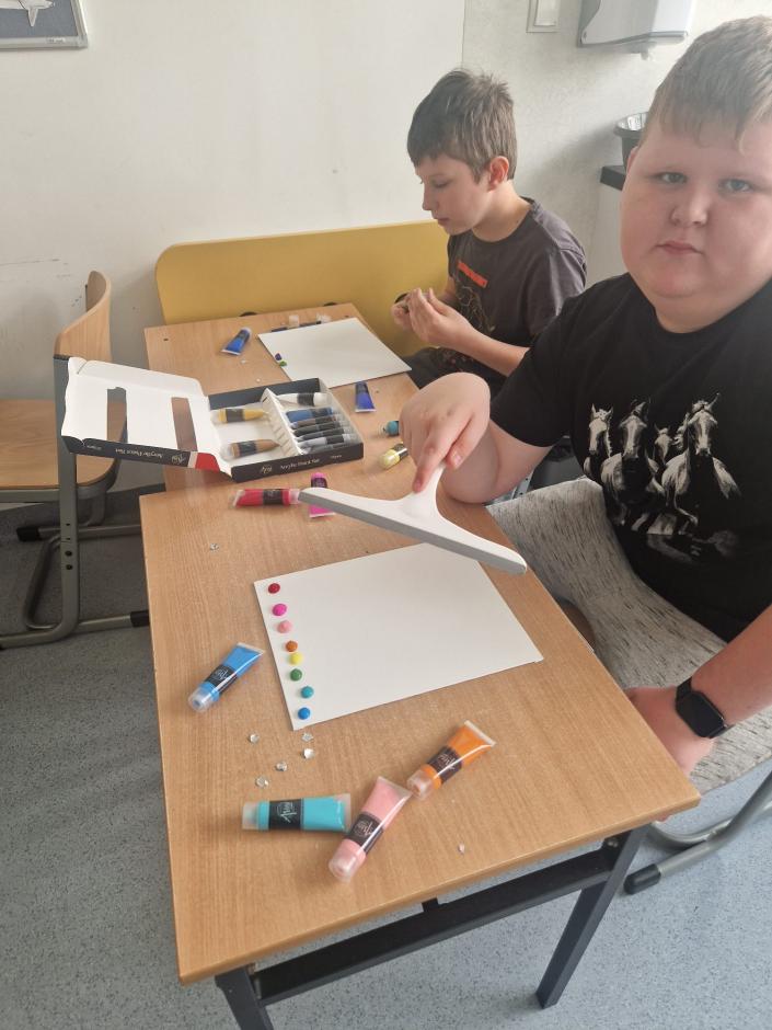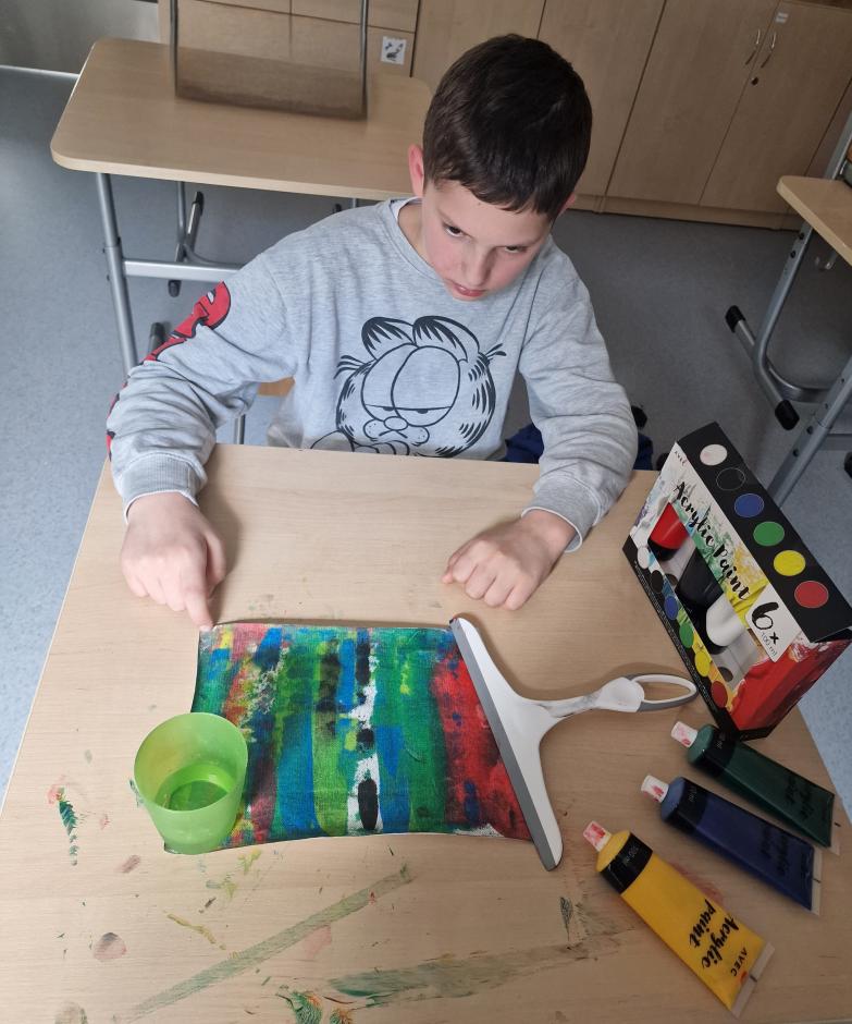 W ramach Ogólnopolskiego Projektu Edukacyjnego „Zabawa sztuką” zrealizowaliśmy w maju zadanie projektowe „Laboratorium koloru”. Wstępem do praktycznych zajęć było zapoznanie uczniów z pojęciami barw podstawowych i pochodnych. W wyniku swoich eksperymentów z farbami dzieci miały okazje doświadczyć, w jaki sposób można uzyskać bogatą paletę kolorów i stworzyły wielobarwne, abstrakcyjne kompozycje wykazując się przy tym zaangażowaniem i wyobraźnią artystyczną.