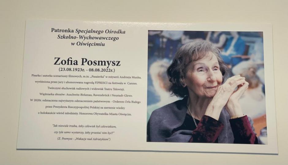W okresie Wszystkich Świętych i Święta Zmarłych wspominamy bliskie nam osoby, których nie ma już wśród nas. Społeczność Specjalnego Ośrodka Szkolno-Wychowawczego w Oświęcimiu szczególną pamięcią otacza zmarłą w ubiegłym roku patronkę ośrodka – panią Zofię Posmysz, zasłużoną literatkę, laureatkę wielu odznaczeń, osobę niezwykle skromną i serdeczną. Nauczyciele i młodzież cały rok sprawują pieczę nad porządkowaniem grobu, składają na nim kwiaty i zapalają symboliczne znicze.