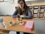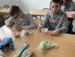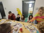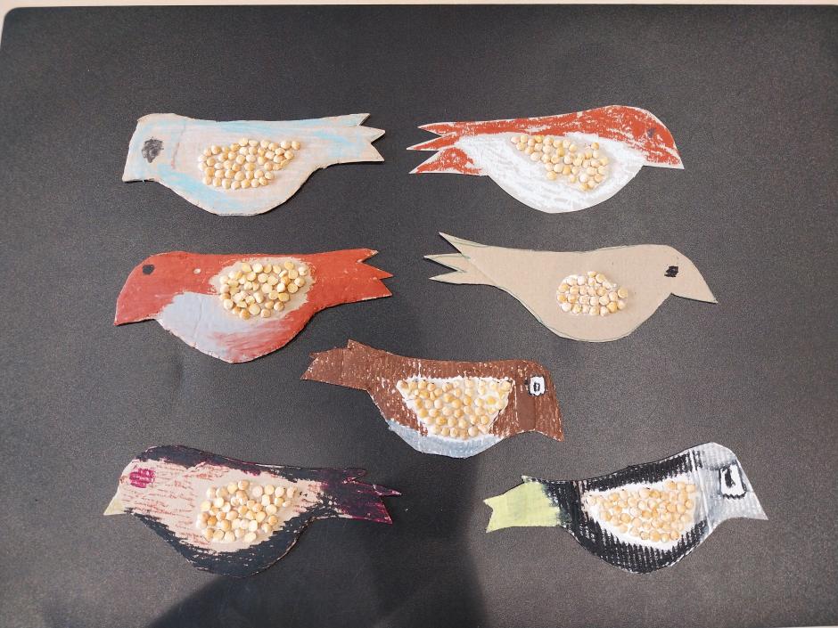 Kolejnym etapem spotkania były prace plastyczne, polegające na ozdabianiu szablonów wróbli różnymi materiałami – papierem, bibułą, plasteliną, ziarnami, piórkami. Powstała całkiem spora galeria wróbelków!