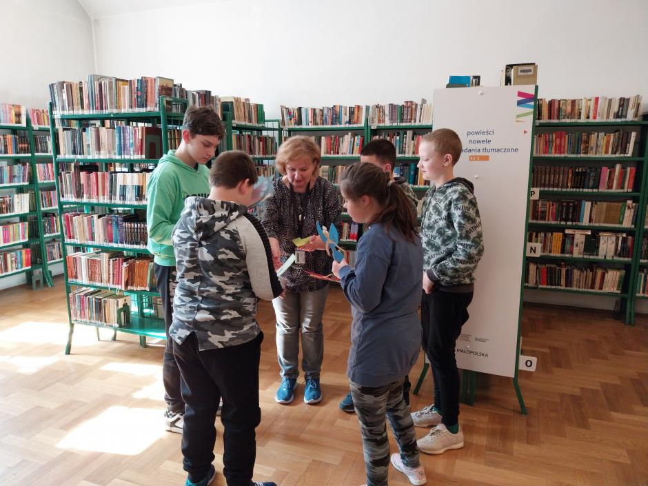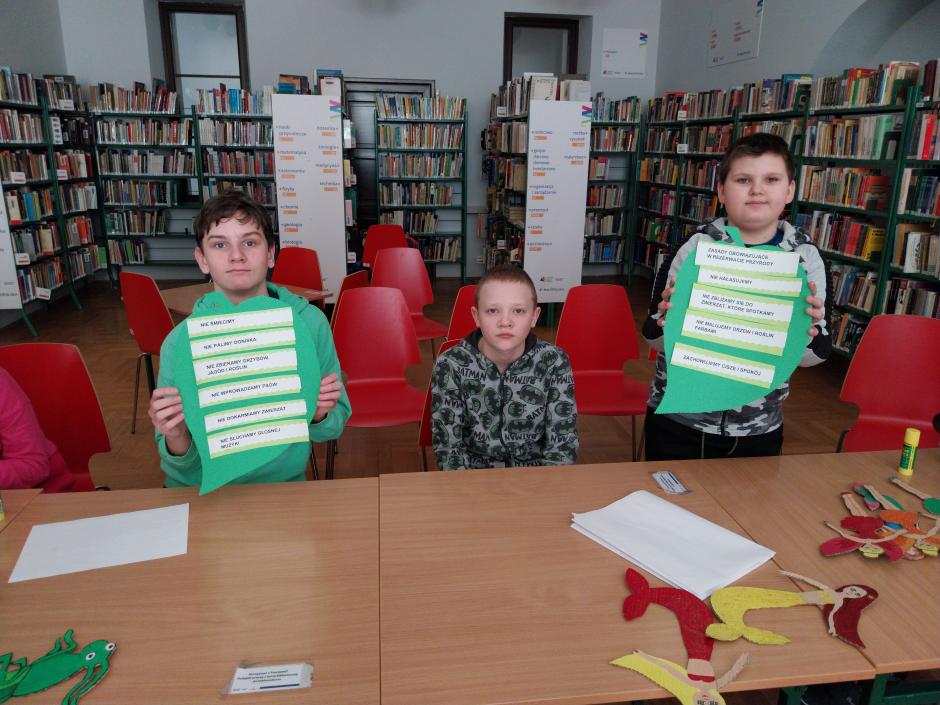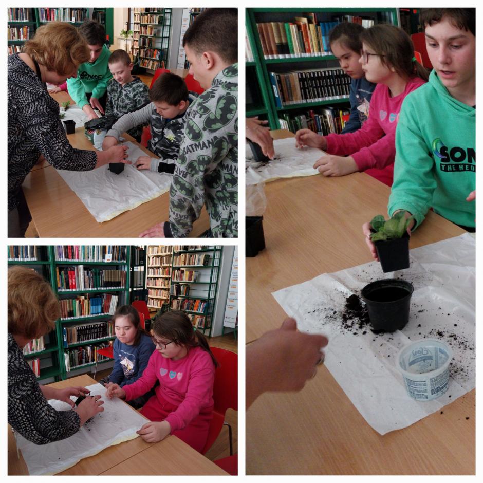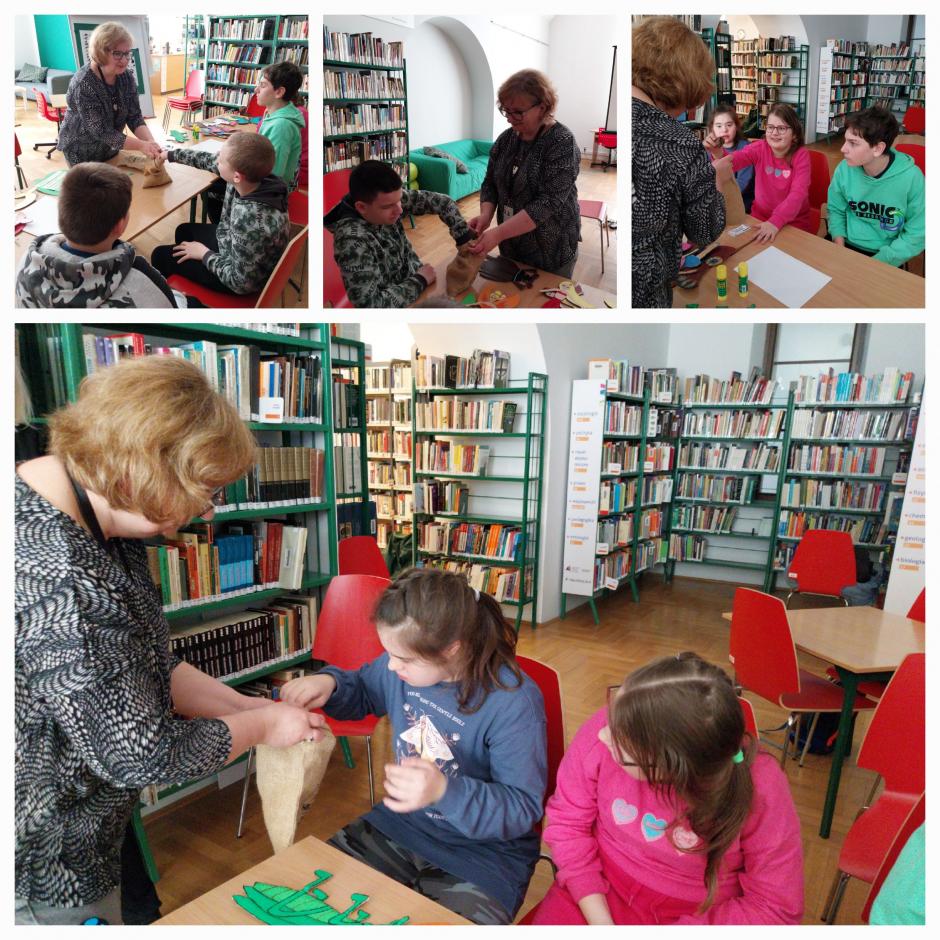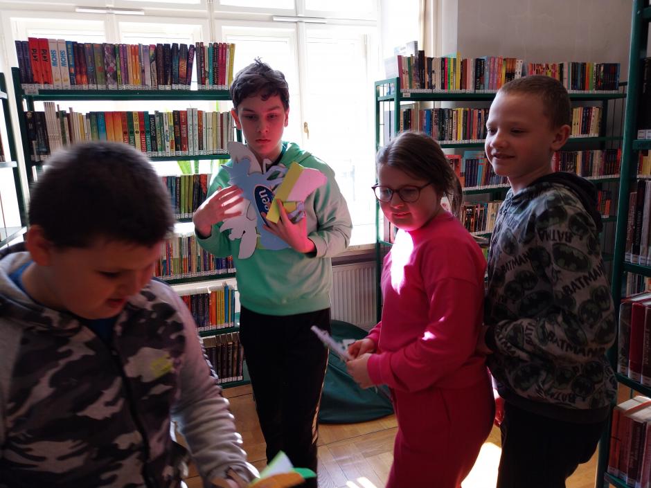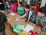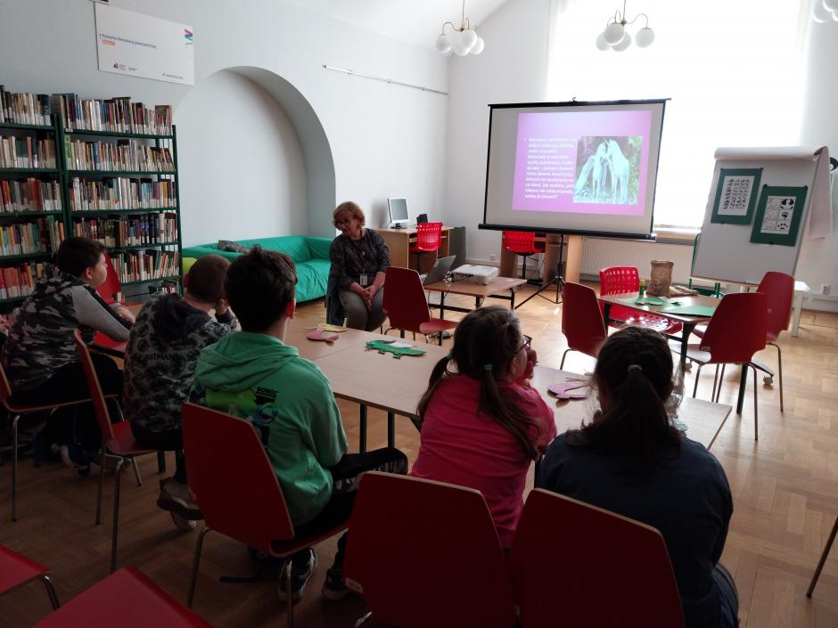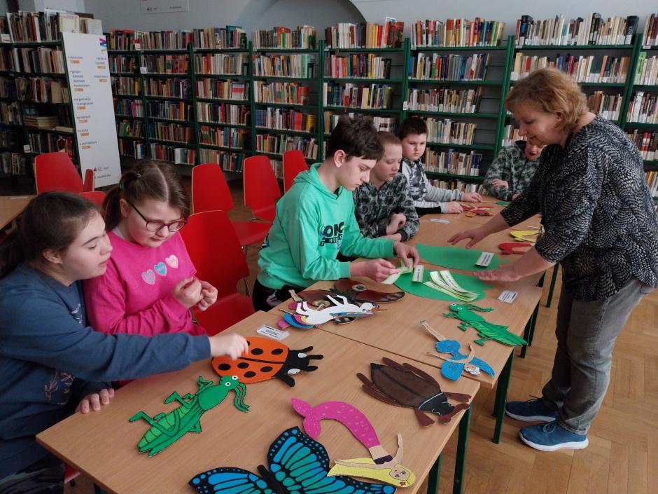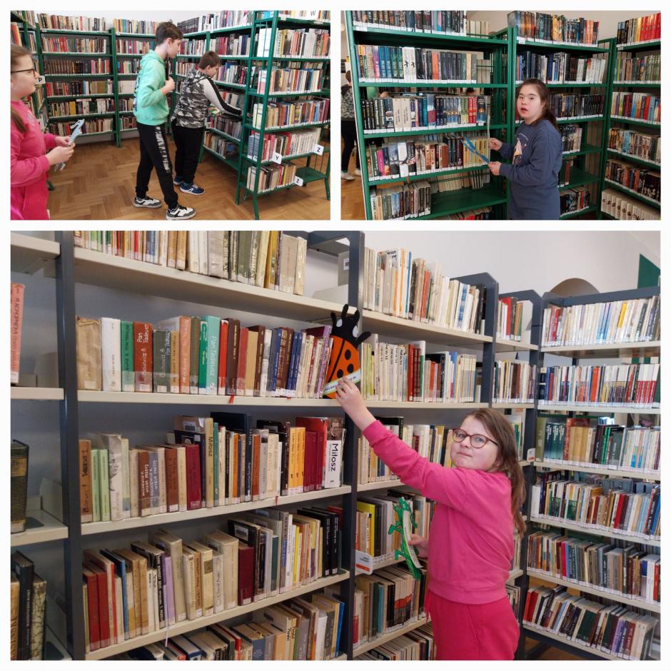 Uczniowie klas 5d i 6b wzięli udział w zajęciach z cyklu „Literackie faworytki”. Wysłuchaliśmy  opowieści z Baśnioboru na podstawie powieści B. Mulla „Baśniobór”. Dodatkową atrakcją była dla nas zabawa w podchody, podczas której poszukiwaliśmy wśród zbiorów bibliotecznych ukrytych informacji dotyczących zasad zachowania się w lesie/rezerwacie. Ponadto odgadywaliśmy zagadki przy użyciu worka sensorycznego oraz sadziliśmy rośliny w doniczkach.