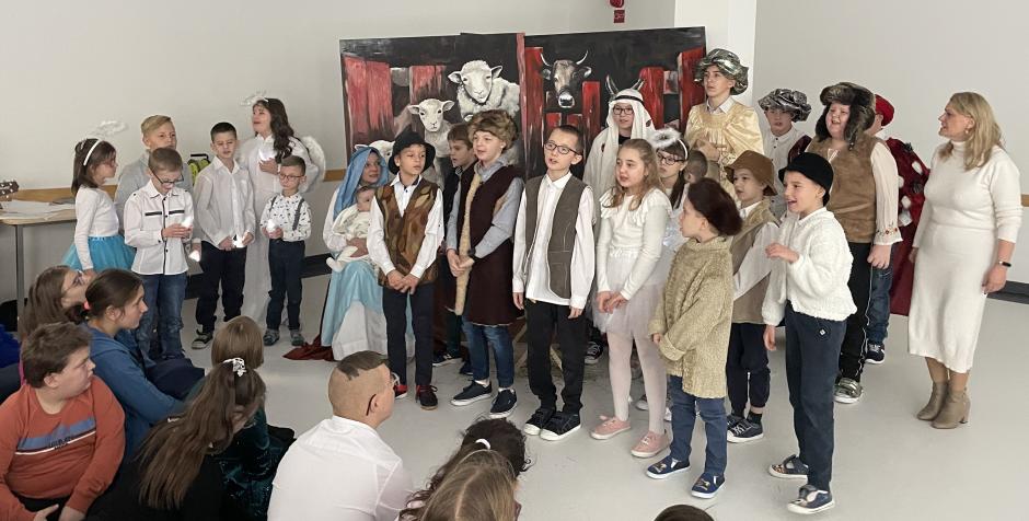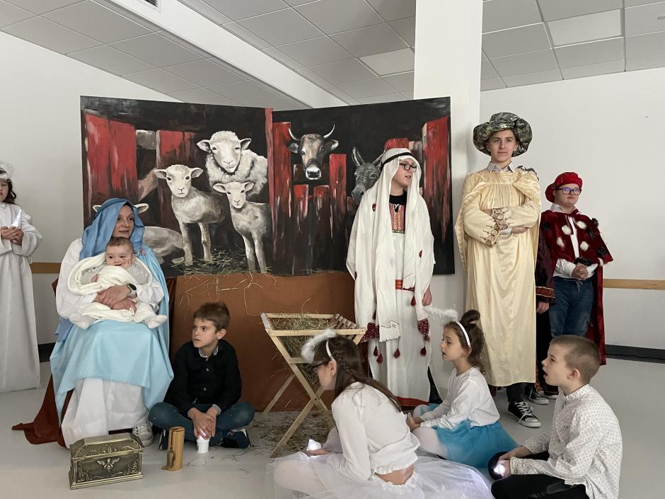 Występujący w tegorocznych Jasełkach Bożonarodzeniowych uczniowie naszej szkoły, gromkim okrzykiem życzyli wszystkim Wesołych Świąt!