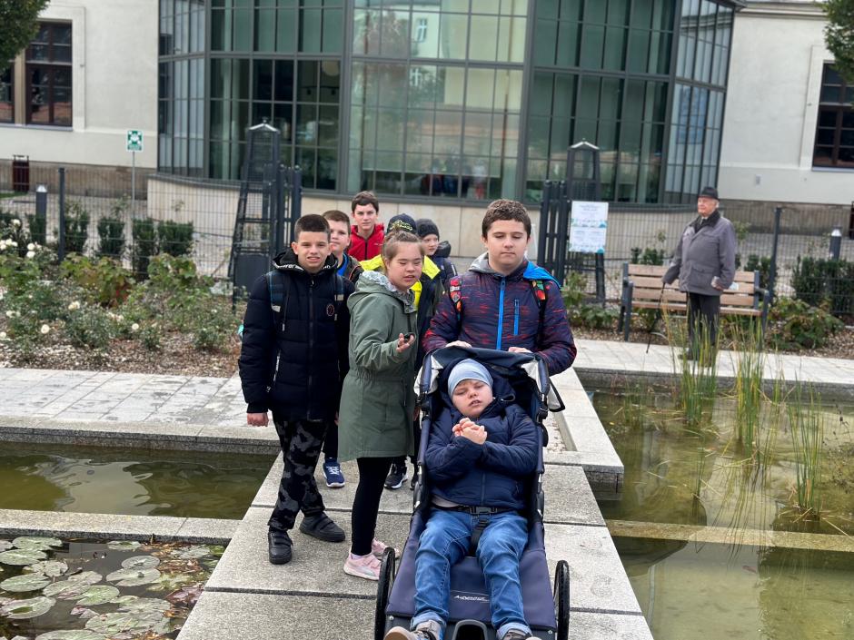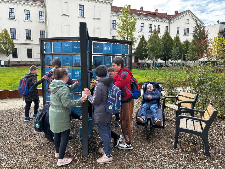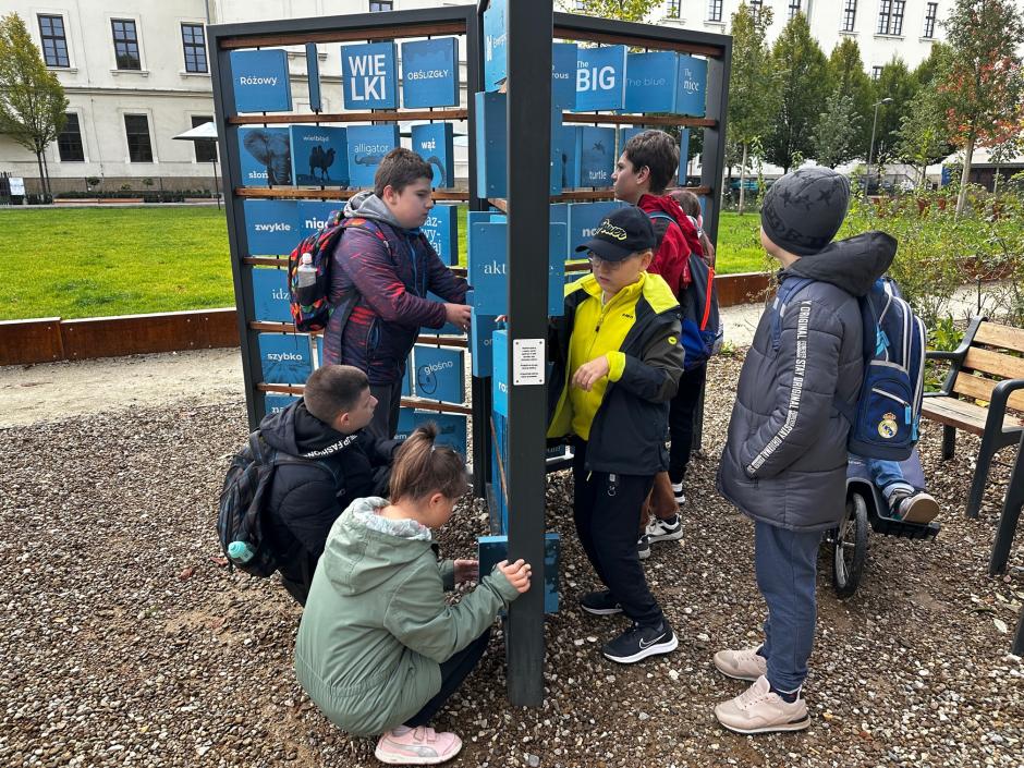 W październiku klasy 5d i 6b udały się z wizytą do literackiego Parku Wisławy Szymborskiej w Krakowie. Uczniowie mieli okazję podziwiać tematyczne alejki parkowe oraz wziąć udział w zabawach językowych na płytkach interaktywnych. +