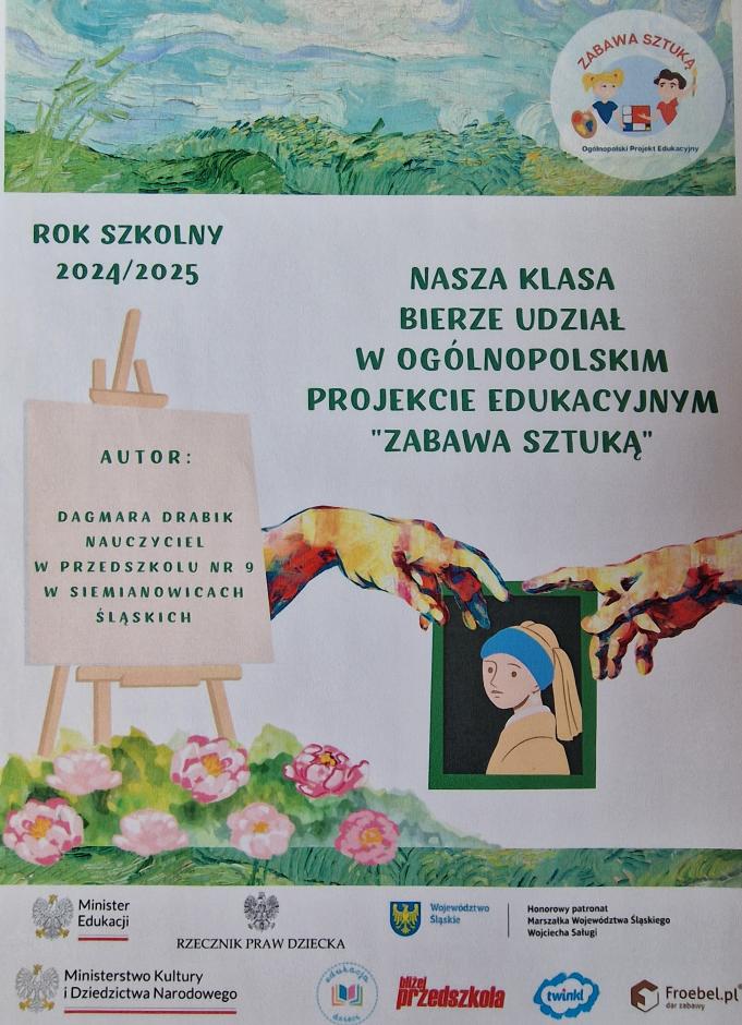 Głównym celem Ogólnopolskiego Projektu Edukacyjnego „Zabawa sztuką” jest propagowanie sztuki przez zabawę w korelacji z kompetencjami kluczowymi oraz zgodnie z założeniami pedagogiki freblowskiej.
