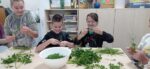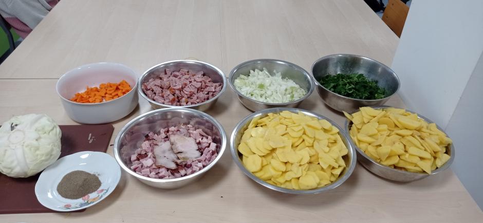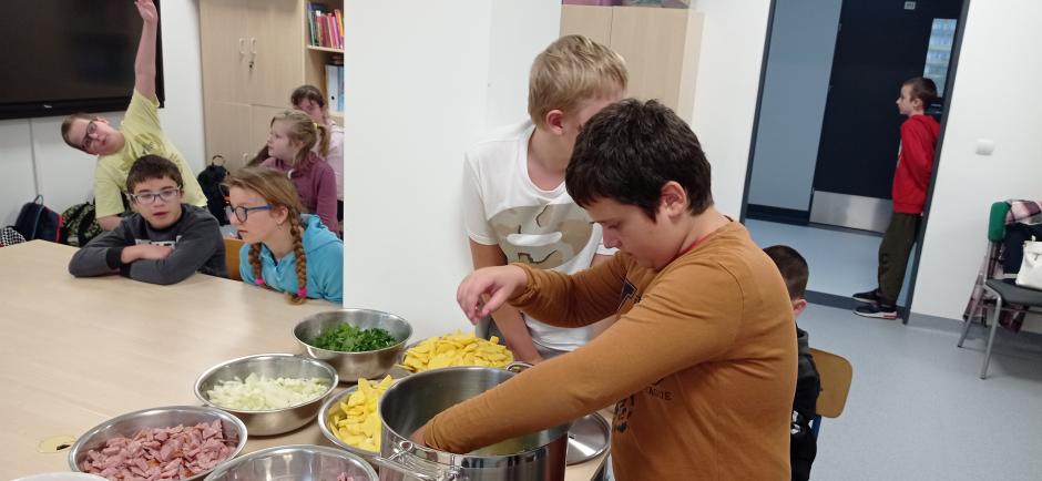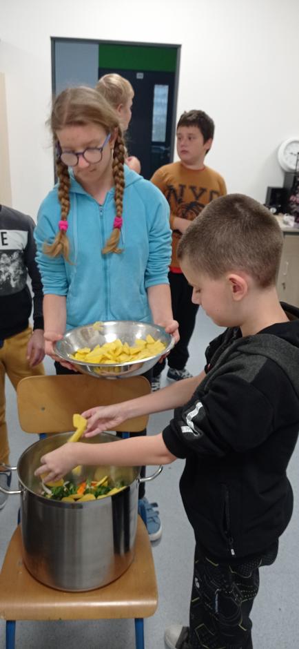 Uczniowie utrwalili zasady BHP podczas pracy z produktami spożywczymi oraz ostrymi narzędziami, myli, obierali, kroili warzywa potrzebne do przygotowania potrawy.