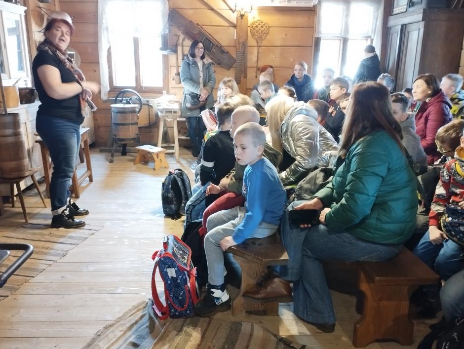 Program wycieczki zakładał min. zwiedzanie zabytkowej chałupy, przybliżenie życia naszych przodków: gdzie mieszkali, jak żyli, co jedli, jak wyglądała dawna kuchnia i jej wyposażenie, w jakich warunkach spali, jak wyglądała łazienka itd. W arce ze zwierzętami gospodarskimi uczniowie karmili i głaskali kozy, owce, króliki. Oglądali i poznawali narzędzia potrzebne do chowu zwierząt. Uczestniczyli w czerpaniu wody ze studni z żurawiem, dowiedzieli się po co była woda, skąd ją pobierano i do czego jeszcze wykorzystywano studnię. Największą atrakcją okazało się samodzielne wykonanie podpłomyków, ich wypiek oraz degustacja podpłomyków i chleba żytniego z domowym masełkiem, miodem, smalcem z ziołami i kawą zbożową. Na koniec był krótki czas na zabawę w stodole z maszynami rolniczymi
