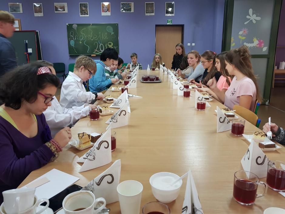 Na zaproszenie wolontariuszy ze SP w Rajsku oraz p. M. Wilk-Grabowskiej, wychowankowie Internatu pod opieką p.S. Ćwiękały i p. S. Magiery uczestniczyli w zorganizowanych dla nich ANDRZEJKACH . Podczas imprezy nasi podopieczni uczestniczyli w różnych zabawach i konkursach tanecznych, karaoke oraz wróżbach. Nie obyło się także bez pysznego poczęstunku oraz zwiedzania hali sportowej na której odbył się krótki mecz w piłkę nożną. Na koniec zostaliśmy bardzo zaskoczeni i obdarowani prezentem w postaci dwóch zestawów do Karaoke, które bardzo nas ucieszyły, gdyż lubimy śpiewać i na pewno wszyscy wychowankowie Internatu skorzystają z takiego prezentu. W rozśpiewanych nastrojach, z uśmiechami na twarzy i czekoladowymi podarunkami w kieszeniach, zadowoleni wróciliśmy do Internatu .