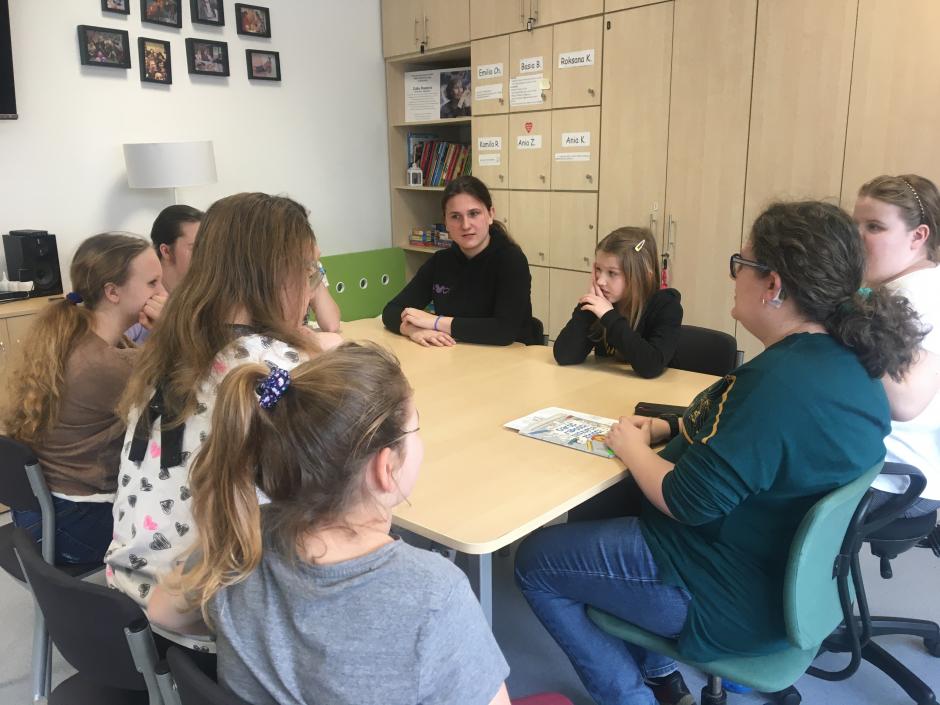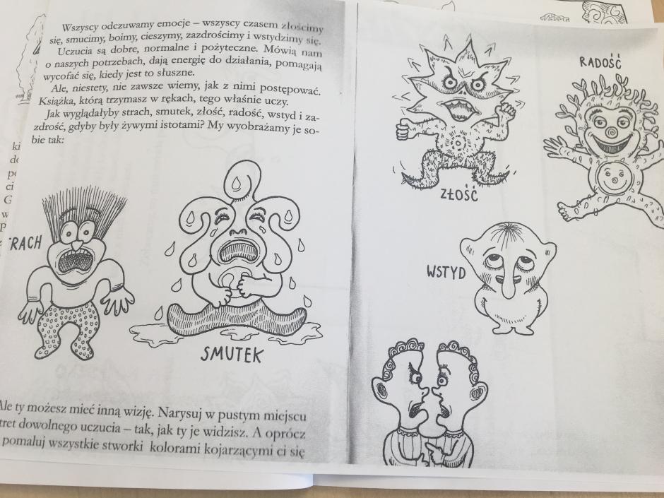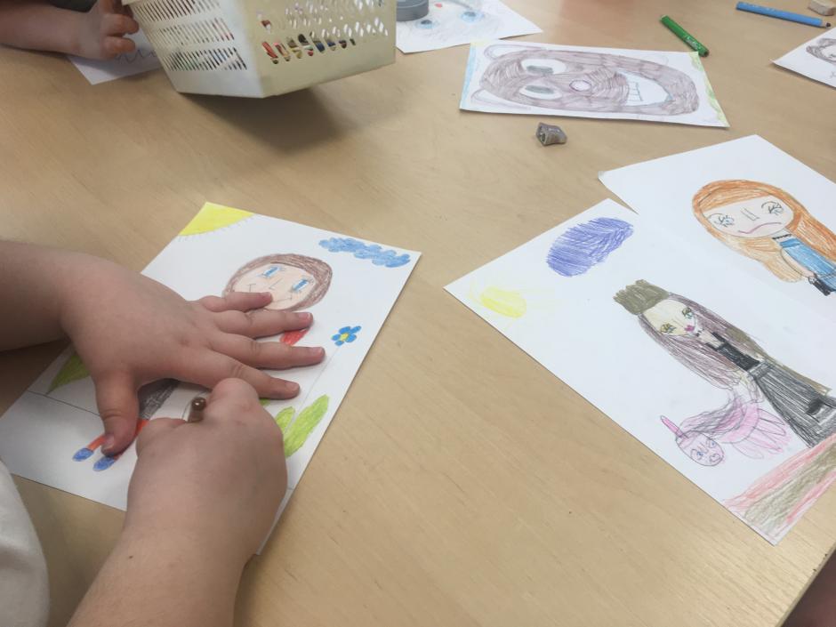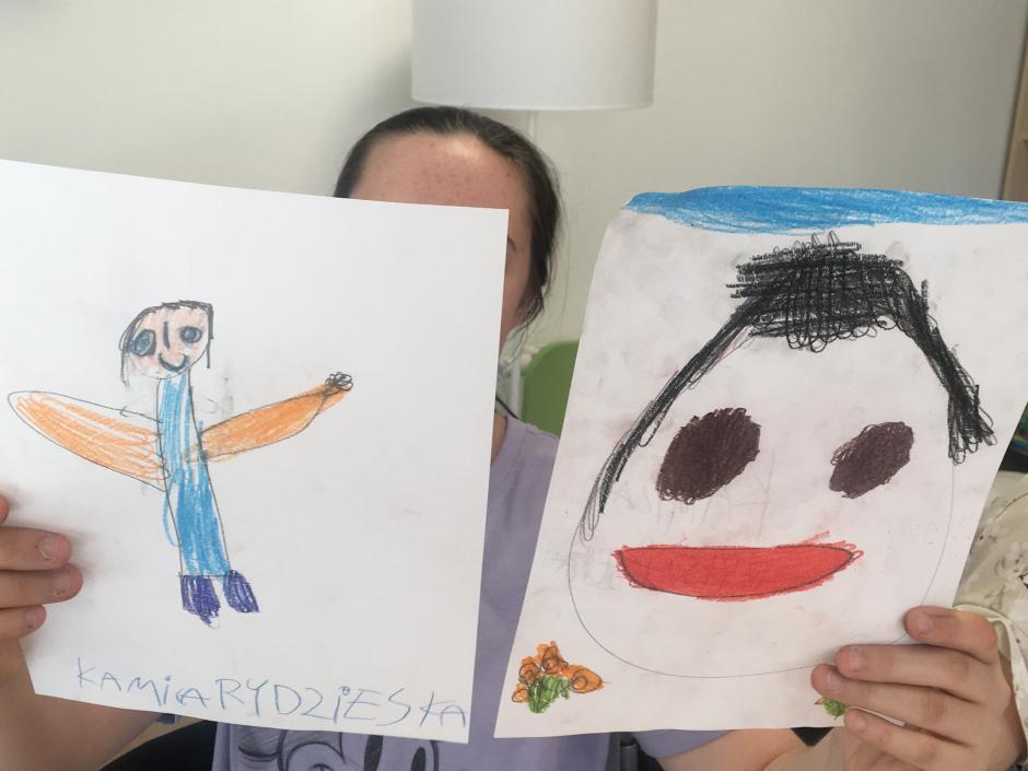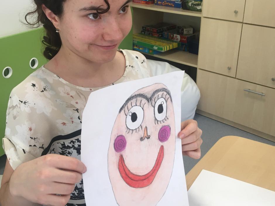 Temat spotkania: „Emocje – Niech żyje Radość!”. Wychowanki miały okazję, aby tym razem porozmawiać o emocjach, które towarzyszą nam na co dzień pozytywnych i negatywnych. Pani Ania w czytała o różnych humorkach. Po lekturze dziewczynki malowały radosny nastrój w postaci kolorowych portretów i postaci.