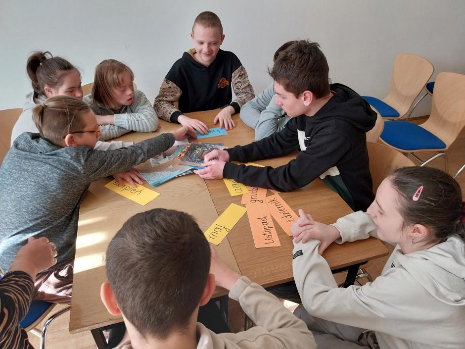 „Baśń o dwunastu miesiącach” opowiadająca historię dziewczynki, która mimo przeciwności losu czyni dobro była kolejnym tematem z cyklu zajęć Literackie faworytki, w której uczestniczyli uczniowie klas 6c i 6d. Podsumowaniem zajęć czytelniczych było wspólne wykonanie obrazu na drewnie „Leśne fiołki”.