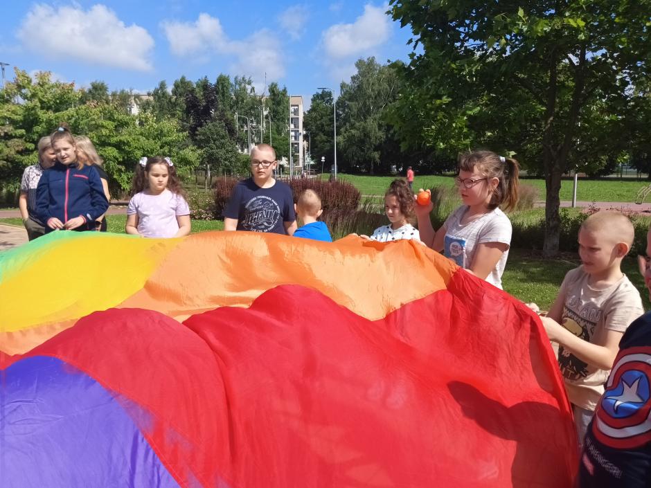 w slalomie, grali w kręgle, spacerowali po wyznaczonej linii, przenosili wybrane przedmioty, skakali na skakance. Dzieci zaangażowali się także w wakacyjne obrazy malowane kolorową kredą. Ważnym punktem były zabawy z chustą animacyjną. Ta wspaniała forma rozrywki to także cenny sposób na rozwijanie różnorodnych umiejętności i zdolności dzieci. Zabawy były bardzo proste, przyjemne, dające mnóstwo radości. Za aktywność oraz zaangażowanie Pani Agnieszka i Pani Ela przyznawały punkty. Wszyscy uczniowie pięknie sprostali zadaniom. Otrzymali zasłużone nagrody. Gratulujemy i zapraszamy na kolejne spotkania.