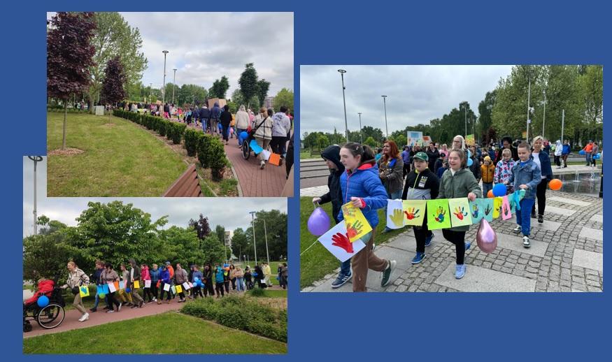 Każdy chętny uczestnik odbił swoje dłonie na kartkach, z których następnie powstał różnobarwny łańcuch połączonych dłoni. Następnie po raz kolejny uczniowie naszej szkoły wzięli udział w kolorowym pochodzie. Ze śpiewem na ustach i przy akompaniamencie gitary przeszliśmy z transparentami spod budynku szkoły w okolice fontanny na Zasolu, gdzie tradycyjnie już zostały odczytane prawa osób z niepełnosprawnością intelektualną.
