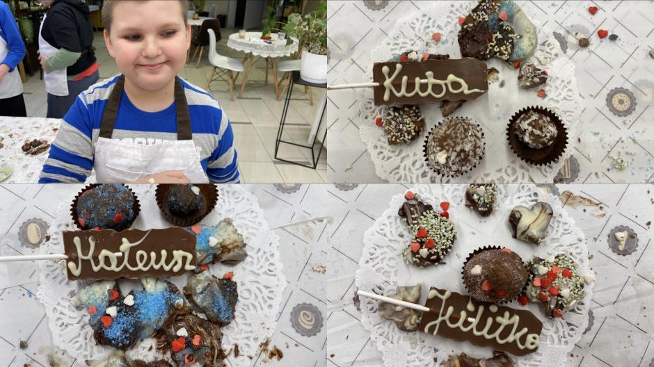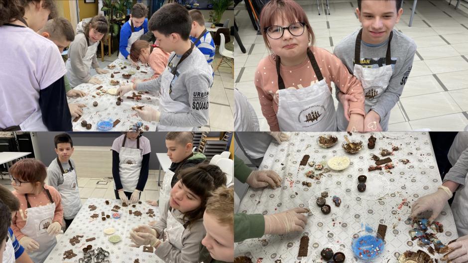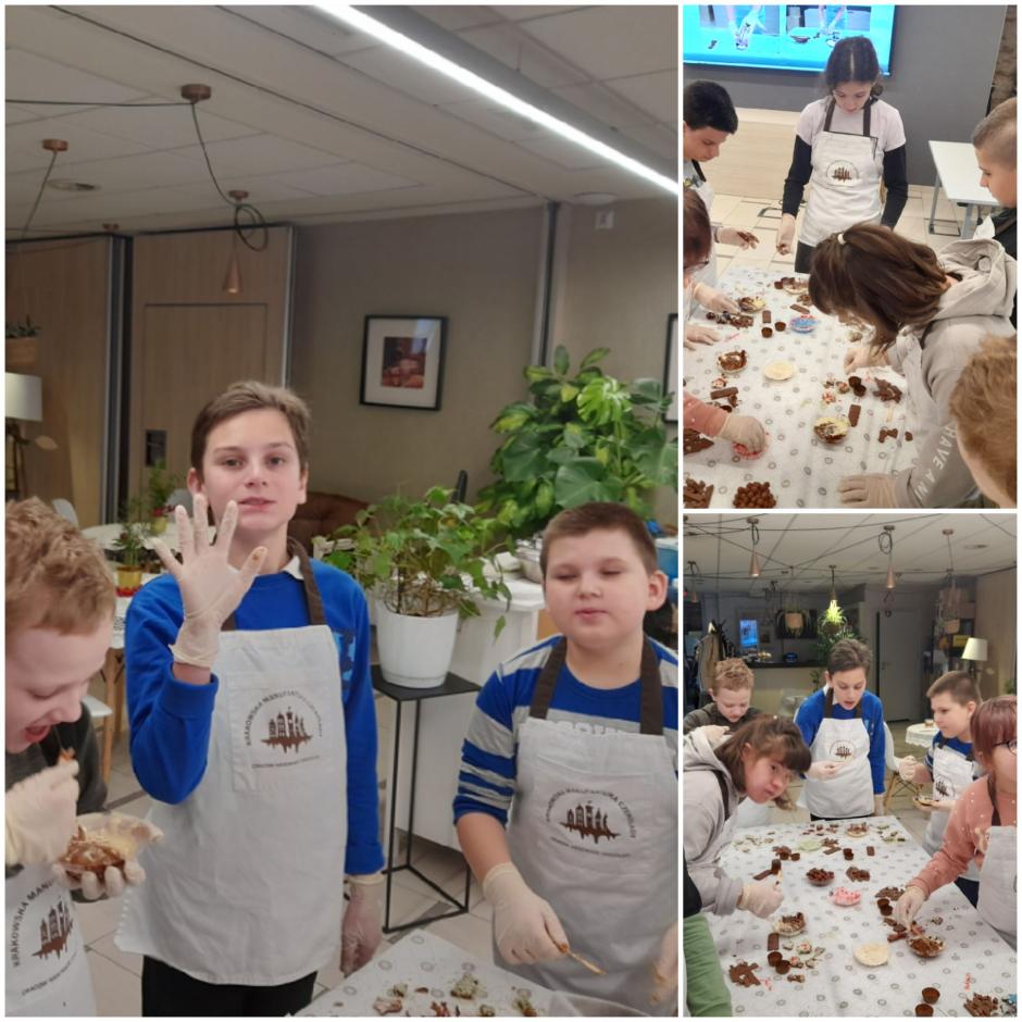 Nowy Rok klasy 5c i 6d rozpoczęły od wizyty w Krakowskiej Manufakturze Czekolady, gdzie podczas warsztatów poznaliśmy historię powstania czekolady i proces jej wytwarzania. W części praktycznej przygotowywaliśmy czekoladowe praliny, które ozdabialiśmy kolorowymi posypkami, rysowaliśmy topioną czekoladą, pisaliśmy na czekoladowych lizakach swoje imiona. Każdy uczestnik miał wykonany słodki tatuaż. Na koniec otrzymaliśmy własnoręcznie zrobione słodycze w ozdobnych pudełkach oraz certyfikat cukiernika.