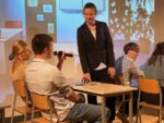 Weronika S., Mateusz B., Gabrysia O., Gabriel Cz., Adrian P., Justyna T., Julia W., Jan M. oraz  Jakub G. w roli uczniów i pani Reni B. w klasie szkolnej,