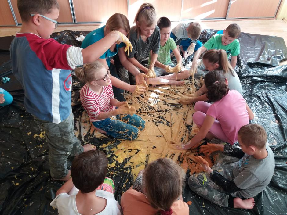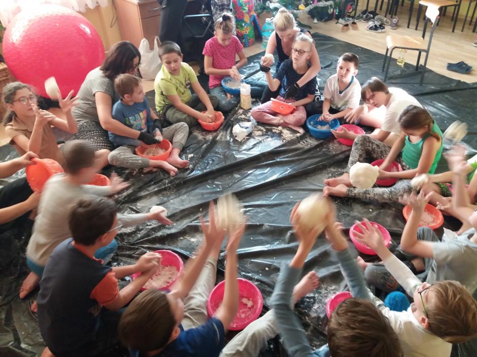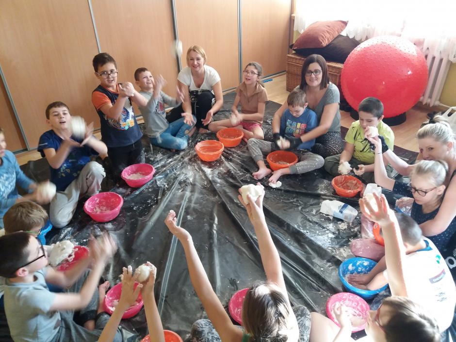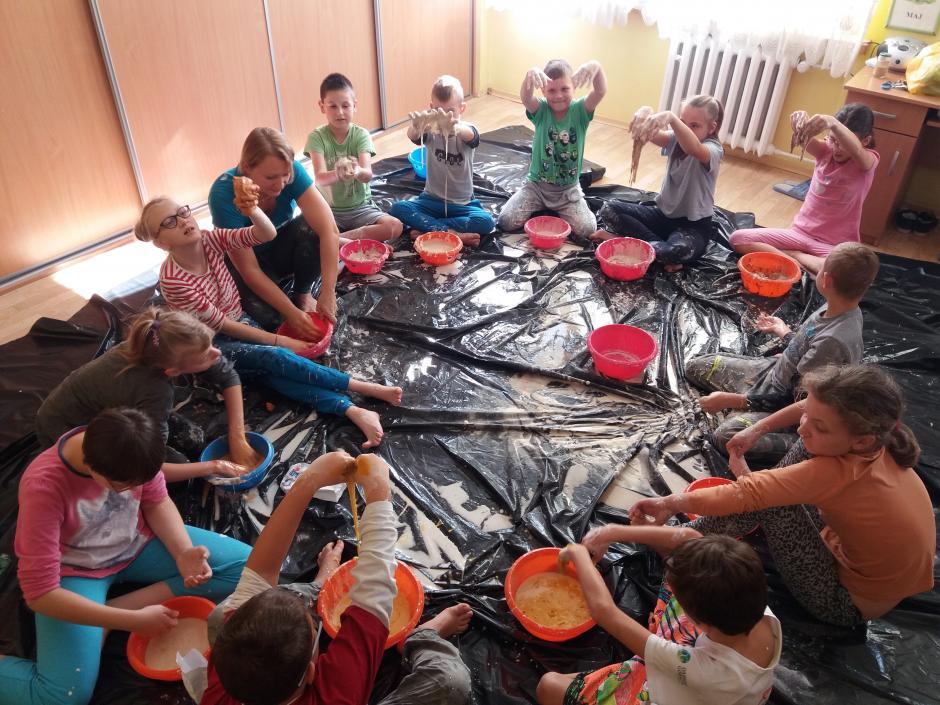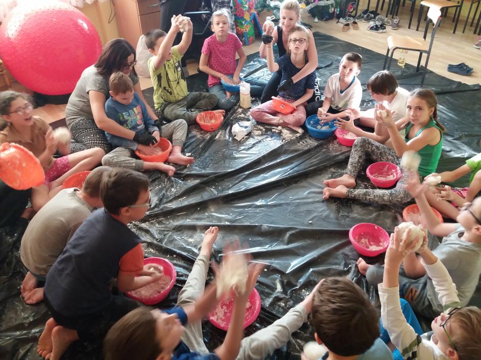 Materiały sensoryczne na zajęciach opierają się wyłącznie na wykorzystaniu w 100% bezpiecznych produktów spożywczych. Przygotowujemy wolną przestrzeń. Pracujemy w ubraniu przeznaczonym do ubrudzenia, nie zakłócając w ten sposób naturalnego procesu spontanicznej aktywności twórczej ucznia. Zadajemy pytania zamiast wydawać polecenia. Dostrzegamy sytuacje trudne i wspieramy w ich doświadczaniu. Dzieci są kreatywne, twórcze, lepią, sypią, gniotą, malują, formują kształty, wielozmysłowo poznają i przetwarzają świat wychodząc poza schemat, a przy tym znakomicie rozwijają swoje umiejętności komunikacyjne.