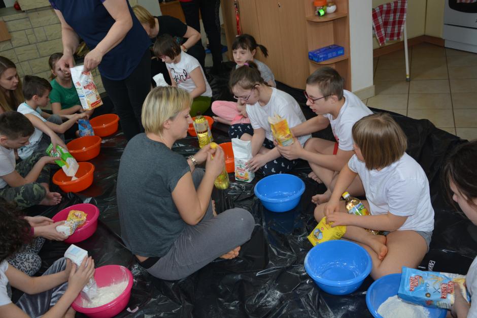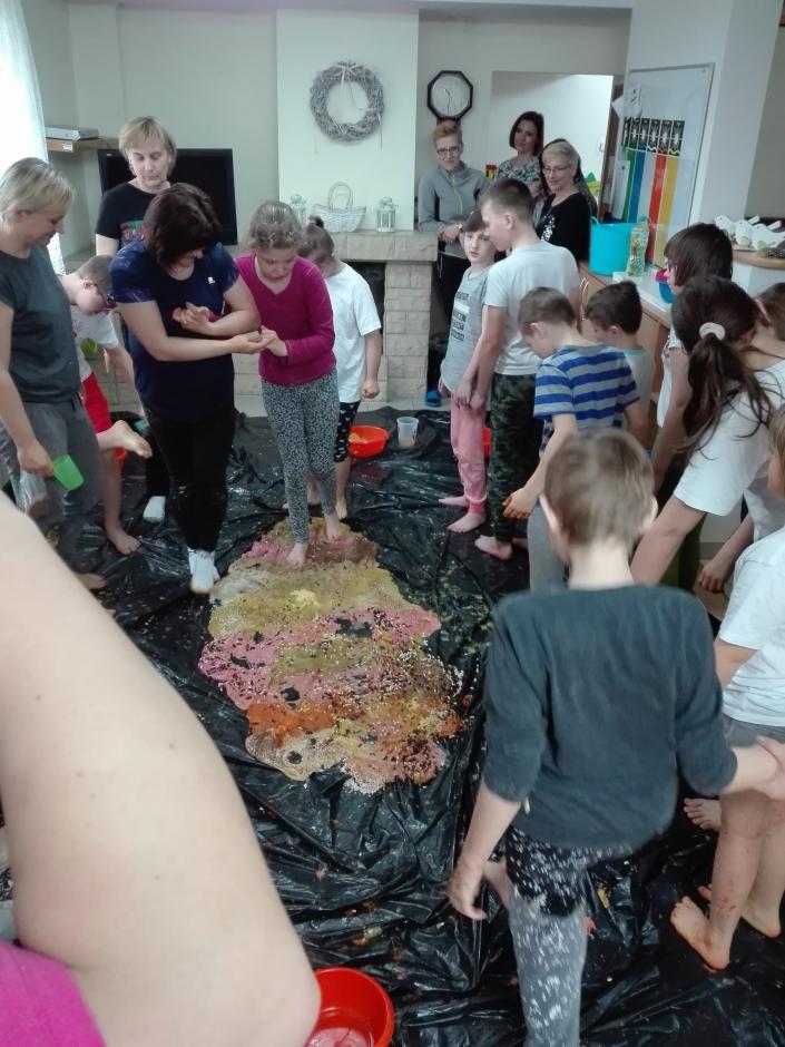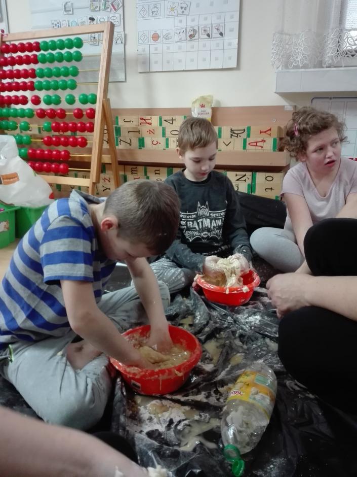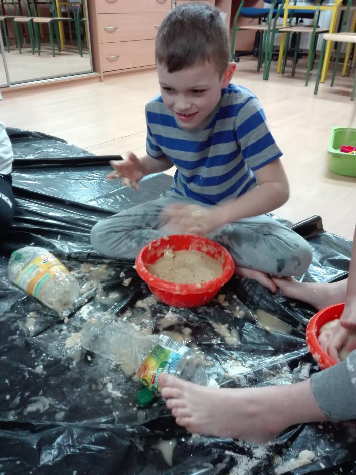 Bazę do zajęć uczestnicy wykonali z mąki pszennej, oleju i wody. Ich różne proporcje sprawiły, że każde z dzieci miało inną masę. Dla uzyskania ekologicznych barw wykorzystali przyprawy: cynamon, kurkumę, sok z buraczków, paprykę czerwoną, chili, imbir. Kolorowy dywan sensoryczny wzbogacili ziarnistościami min. kawą, fasolą, ryżem, kaszą gryczaną, siemieniem lnianym, nasionami Chii. Żeby doznania sensoryczne były mocniejsze nie zabrakło aromatów. Uczniowie odczuwali ogromną satysfakcję z kreatywnego działania i z możliwości pracy w wolnej przestrzeni. Zadawali pytania, prosili o pomoc, mówili o swoich emocjach. Samodzielnie wykrawali wiosenne kwiaty, które później pod okiem nauczyciela były pieczone.  Czas warsztatów sensoplastycznych to czas eksperymentu, i to nie tylko dla dzieci…