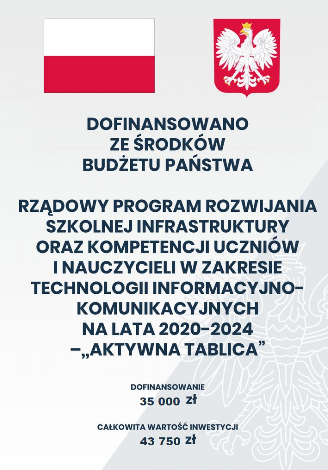 Miło jest nam poinformować, że nasza szkoła przystąpiła do rządowego programu rozwijania szkolnej infrastruktury oraz kompetencji uczniów i nauczycieli w zakresie technologii informacyjno-komunikacyjnych na lata 2020-2024 – „Aktywna tablica”. W wyniku tych działań otrzymaliśmy finansowe wsparcie na zakup interaktywnych pomocy dydaktycznych.