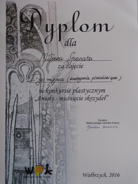 Miłosz Granat zdobył I miejsce w kategorii „Szkoły i Placówki Specjalne” w Ogólnopolskim Konkursie Plastycznym „Anioły – Muśniecie Skrzydeł”.