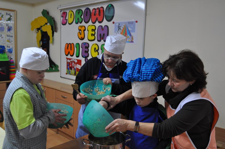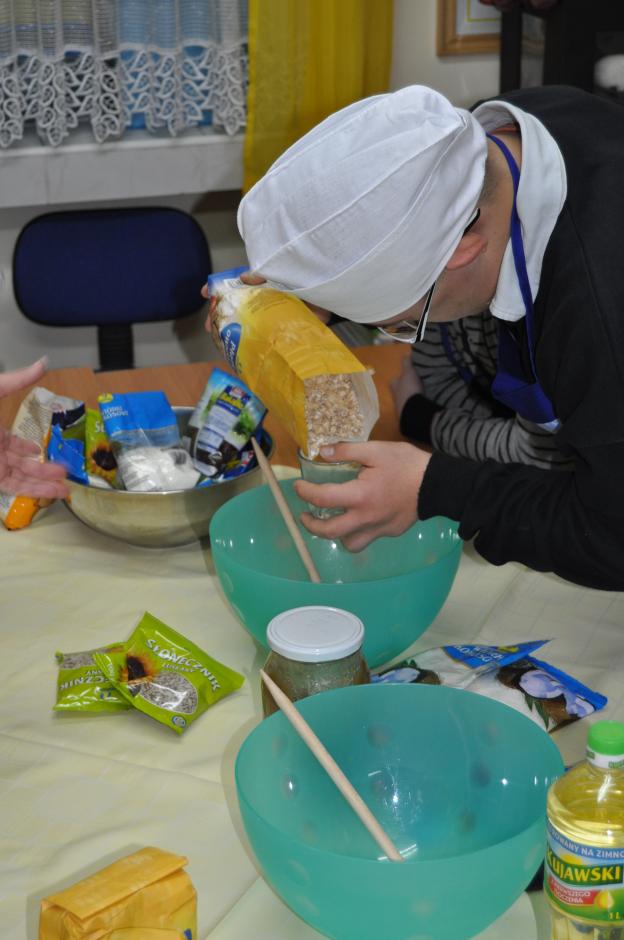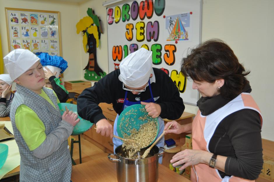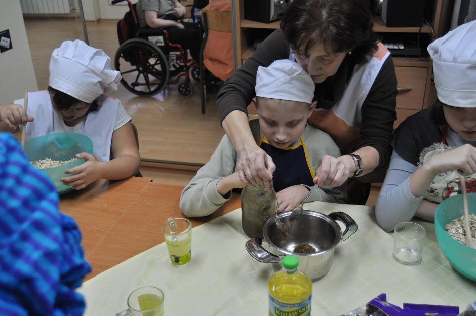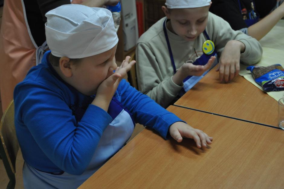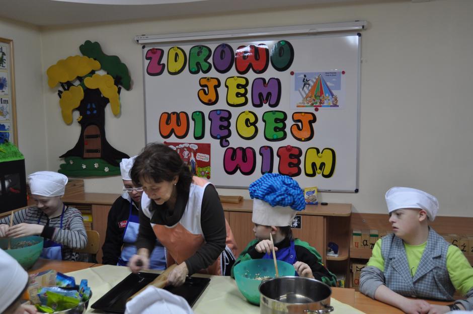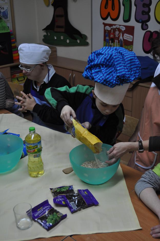 W dniu 26 listopada uczniowie klas: 3SPb, 3SPc, 4SPc oraz 5SPb pod okiem nauczycieli przygotowali zdrową, domową granolę. Dzieci wielozmysłowo poznawały wykorzystywane w niej produkty. Uczyły się odmierzania, mieszania i przesypywania produktów. Radość wspólnego gotowania, cudowny zapach prażonych płatków owsianych z różnego rodzaju nasionami i orzechami unoszący się w całej szkole dodatkowo wprawiał dzieci w dobry i pogodny nastrój. Nasze starania znalazły pozytywny odzew nie tylko w całej społeczności szkolnej, ale i wśród  rodziców naszych uczniów, którzy zdeklarowali aktywnie włączyć się do w/w akcji. Wierzymy, że wymiernym efektem naszych działań będzie ograniczenie w pożywieniu dorosłych i dzieci ilości cukru, na korzyść wartościowego błonnika niezbędnego w ochronie przed nowotworami.