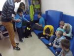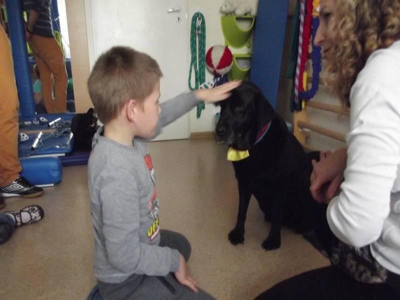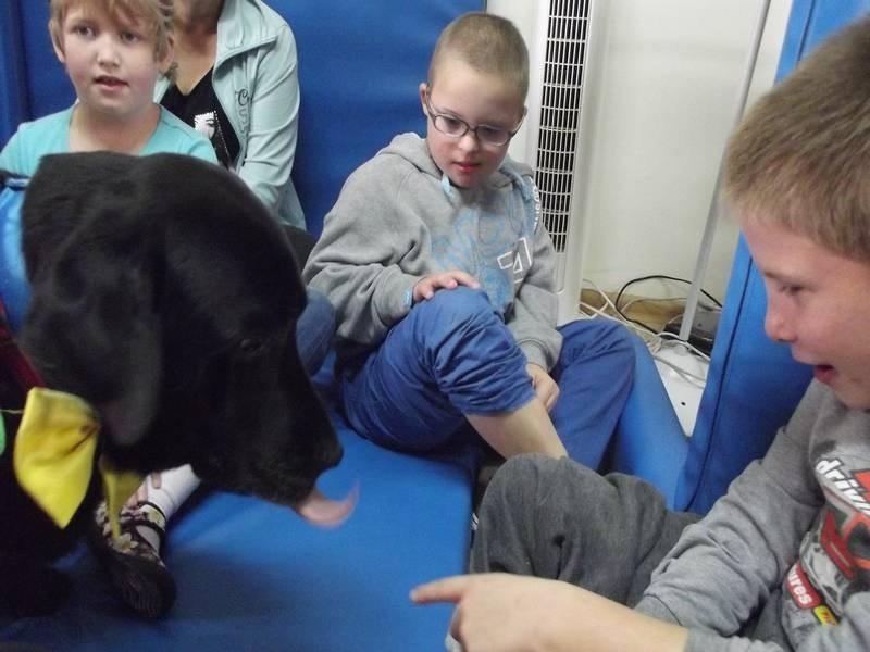W październiku mieliśmy przyjemność gościć P. Jolantę P .- wykwalifikowaną dogoterapeutkę z przeszkolonym psem Nelą. Kontakt z psem sprawił uczniom wiele radości. Dzieci dotykały, głaskały psa, wydawały mu polecenia. W ten sposób zostały zmotywowane do współpracy, pokonywały swoje bariery lęku czy braku pewności siebie, uczyły się empatycznego kontaktu.