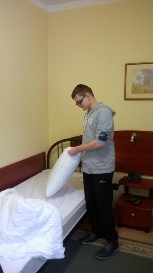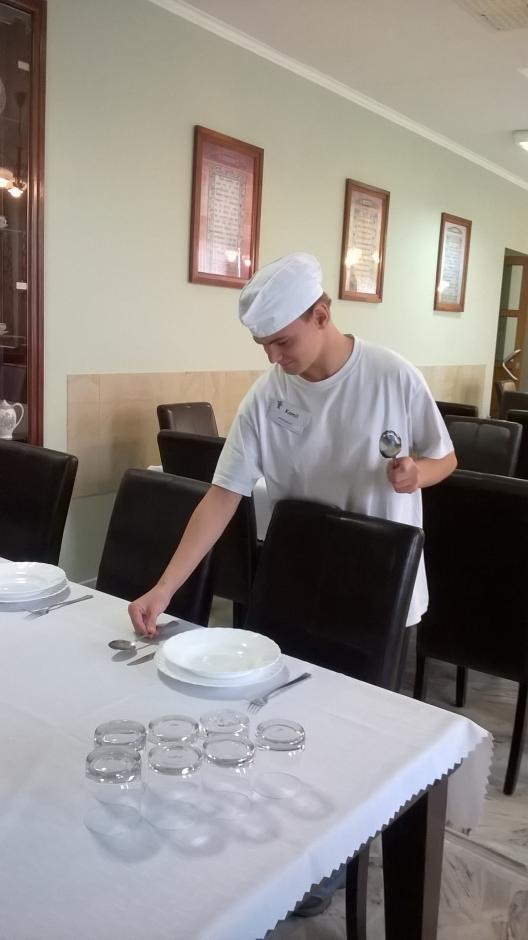 Uczniowie klasy II i III o profilu pracownik pomocniczy obsługi hotelowej w czasie praktycznej nauki zawodu wykonują różne prace. W części gastronomicznej zajmują się obróbką wstępną warzyw, mięsa, sporządzaniem zakąsek, deserów, czynnościami porządkowymi. W dziale obsługi konsumenta przygotowują salę konsumencką do obsługi gości, wykonują czynności w zmywalni naczyń stołowych, prasują bieliznę stołową. W części hotelowej zajmują się przygotowaniem pokoi dla gości, tj. wymianą bielizny pościelowej, odkurzaniem, sprzątaniem węzłów higieniczno- sanitarnych, pielęgnacją roślin zielonych w hotelu i na zewnątrz obiektu. Zdobyte umiejętności praktyczne, będą mogli wykorzystać w przyszłości w wykonywaniu zawodu. Uczniów przygotowuje p. Renata Knapczyk.