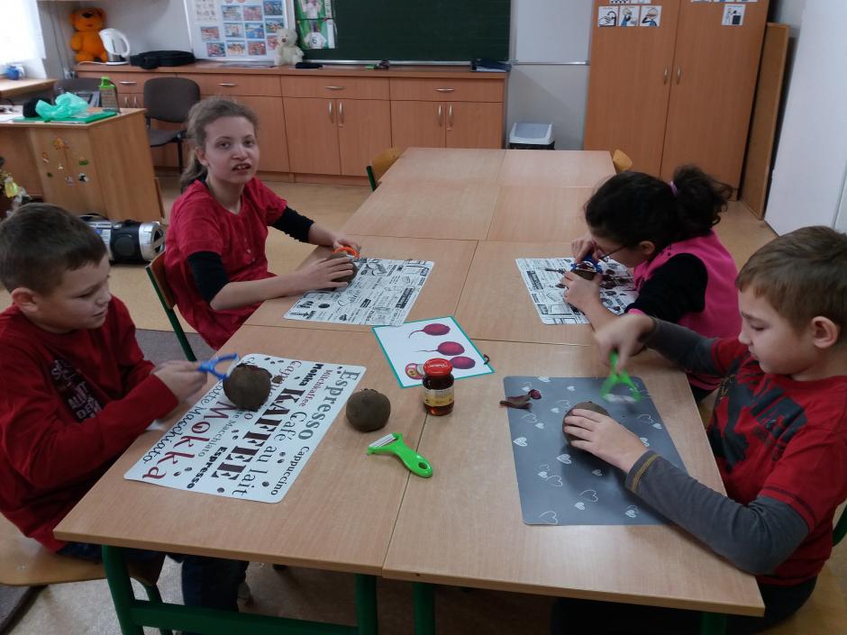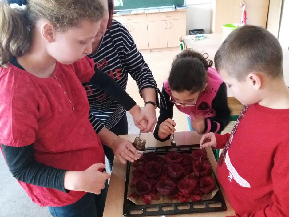 Dzień Buraka świętowali trochę inaczej uczniowie klasy 3b, którzy w tym dniu przyszli ubrani na czerwono. Po obejrzeniu prezentacji, pod okiem nauczyciela przygotowali chipsy i syrop z buraka, który skutecznie rozprawia się z chrypką i uciążliwym kaszlem, zarówno suchym jak i mokrym, a także spowalnia rozwój infekcji wirusowych i bakteryjnych.