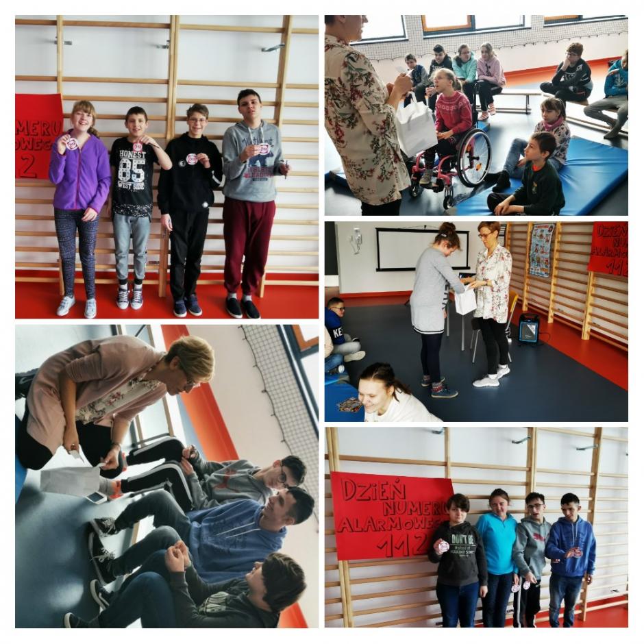 Z tej okazji w czwartek 11 lutego odbyły się zajęcia edukacyjne z zakresu pierwszej pomocy dotyczące wzywania pomocy przez telefon. W zajęciach wzięli udział starsi uczniowie  szkoły podstawowej. Uczniowie zapoznali się z prezentacją multimedialną przypominającą zasady używania numeru 112. Wszyscy chętni mieli okazję sprawdzić swoją wiedzę podczas mini konkursu. Uczestnicy zajęć otrzymali „breloczki – przypominajki” z numerem alarmowym.