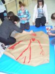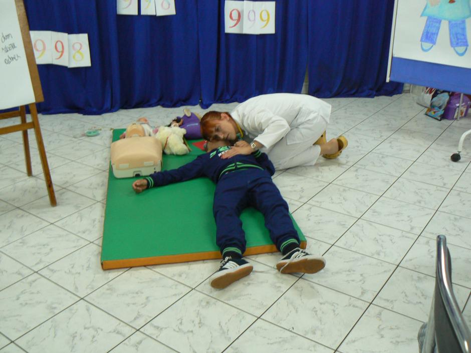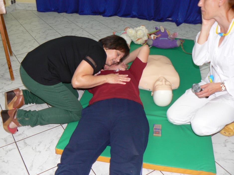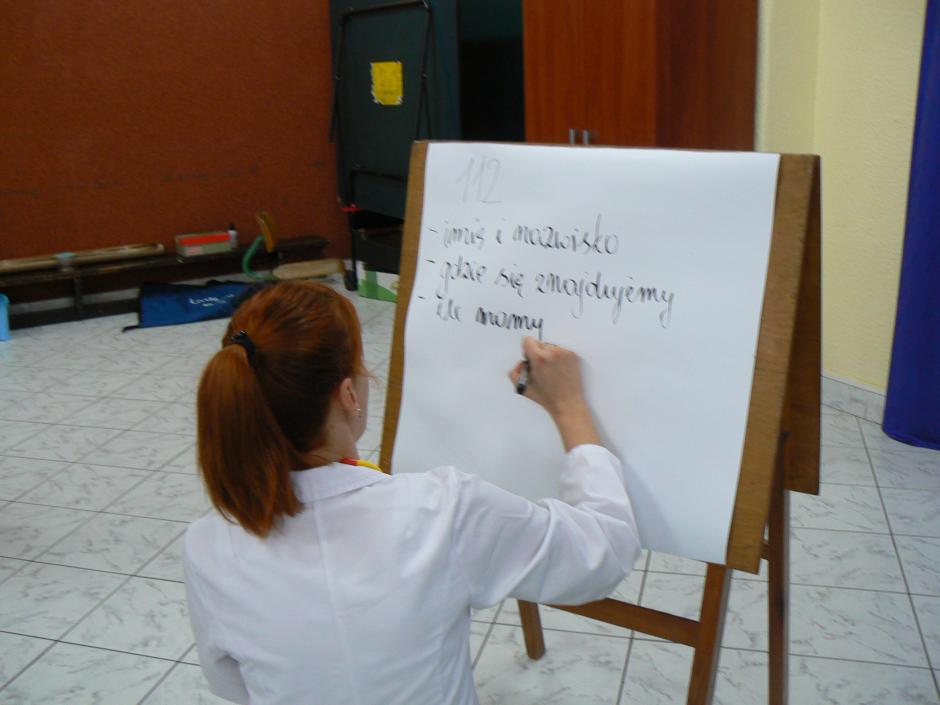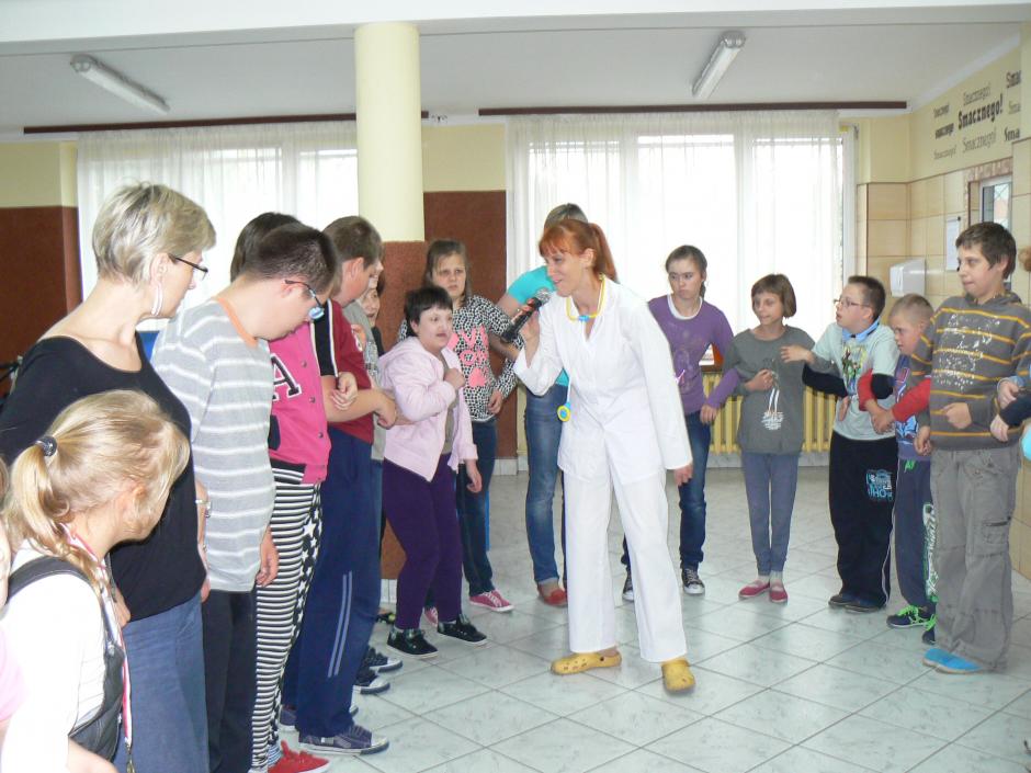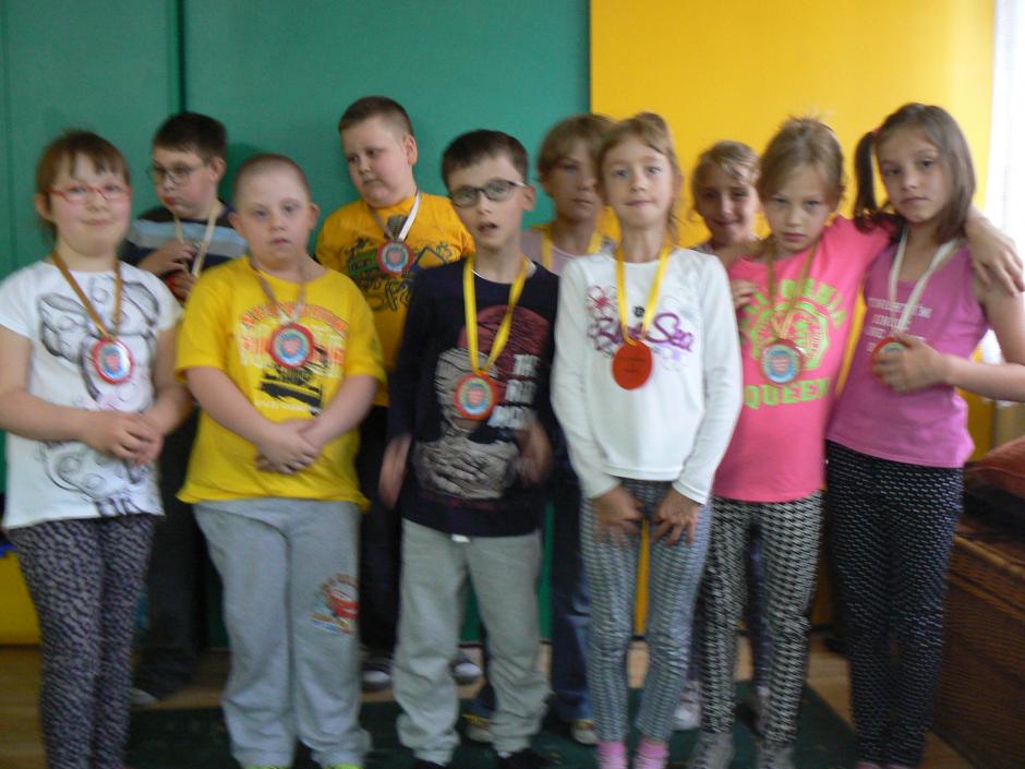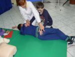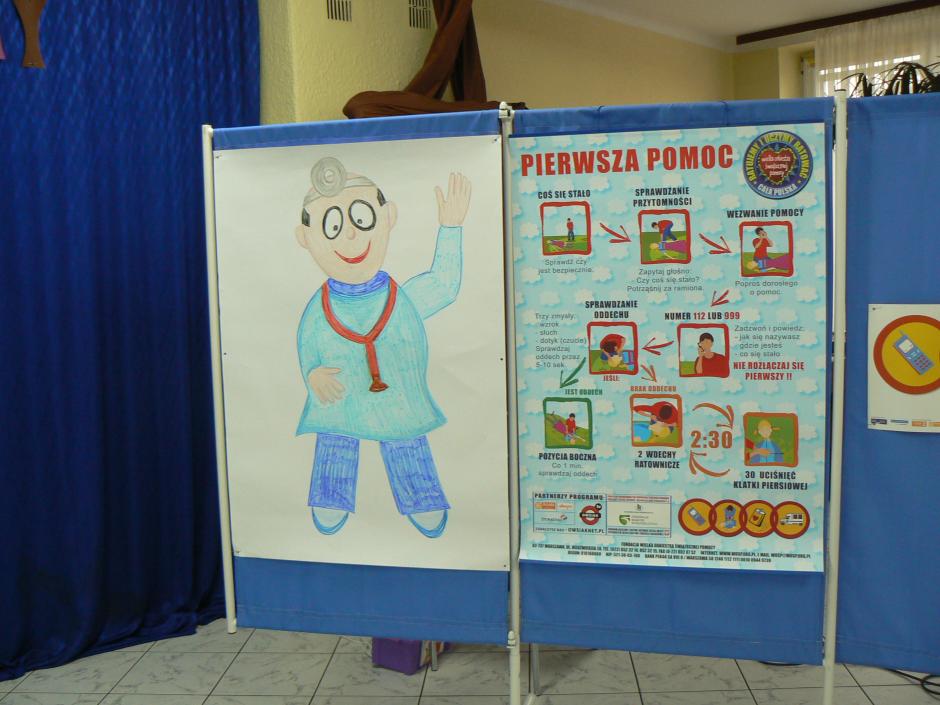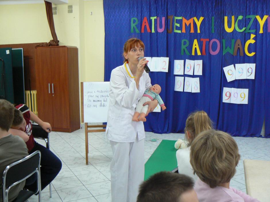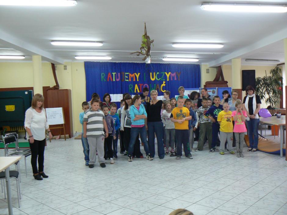 Uczniowie klas 2SPa, 2SPb, 3SPb, 3SPa, 5SPb, 5SPc, 6SPb wzięli udział w zajęciach podsumowujących szkolenie z zakresu podstaw pierwszej pomocy. Przez kilka miesięcy dzieci uczestniczyły w zajęciach praktycznych, w czasie których uczyły się odpowiedniego zachowania w różnych niebezpiecznych sytuacjach. W czasie finału uczniowie spotkali się z wysłannikiem „doktora Kręciołka” i razem powtórzyli najważniejsze zasady udzielania pierwszej pomocy. Utrwalanie ważnych wiadomości przeplatane było wspólnymi zabawami i różnymi zadaniami. Wszystkie dzieci utworzyły wspólny żywy łąńcuch przeżycia, kolorowały numery telefoniczne służb ratunkowych, wykonywały prace plastyczne przedstawiające sposoby docierania krwi do wszystkich części naszego ciała. Ostatnią konkurencją był wyścig „Ratujemy razem”- sprawdzian dokładności i szybkości. Cztery drużyny wykonywały wdechy ratownicze i uciski klatki piersiowej na manekinach. W nagrodę za wspólne zmagania każdy uczeń otrzymał odznaczenie „Ratownik na medal”.