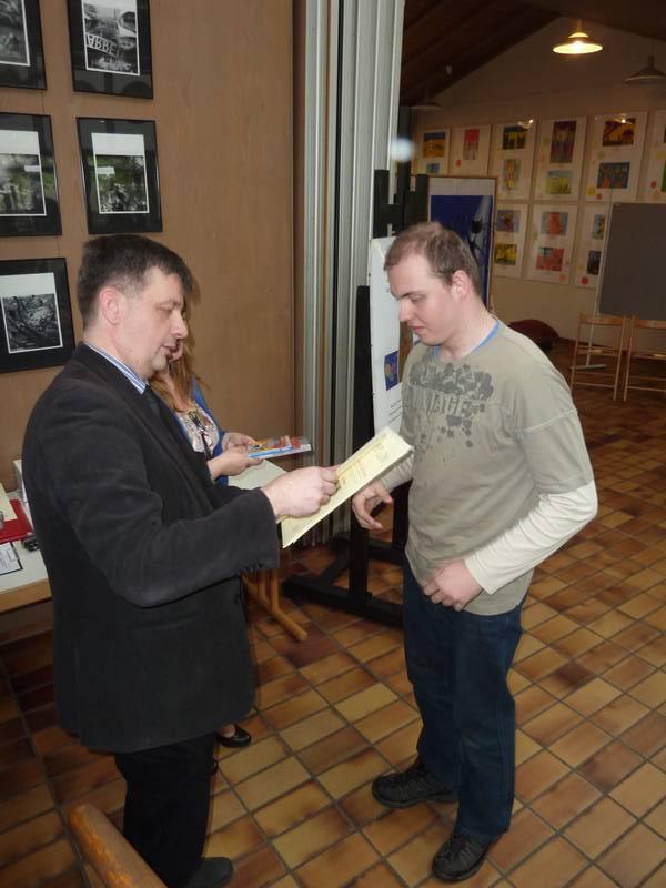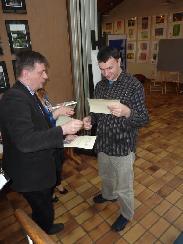 Nagrody laureatom konkursu wręczyli: Naczelnik Wydziału Edukacji Zdrowia i Spraw Społecznych pani Monika Stalica, Wizytator Małopolskiego Kuratorium Oświaty pani Joanna Karp, Dyrektor Poradni Psychologiczno-Pedagogicznej w Oświęcimiu pani Zofia Jarosz, Dyrektor MDSM Leszek Szuster, Dyrektor SOSW w Oświęcimiu Jacek Polak.