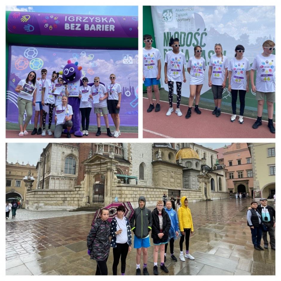 Były to ogólnopolskie zawody sportowe dla dzieci i młodzieży z niepełnosprawnościami zorganizowane z okazji Dnia Dziecka przez Akademicki Związek Sportowy. Dzielni reprezentanci naszej szkoły: Nadia, Aneta, Amelia, Julka, Janek i Błażej zmagali się z innymi zawodnikami w konkurencjach lekkoatletycznych, badmintonie oraz wyścigach na ergometrze wioślarskim. Ten wyjazd był okazją nie tylko do rywalizacji sportowej ale również do zwiedzenia pięknego miasta Krakowa. Pomimo deszczu uczestnicy zobaczyli najważniejsze miejsca: Rynek Główny oraz Wawel. Pełni wrażeń, udekorowani medalami oraz nagrodzeni dyplomami i prezentami zawodnicy wrócili do Oświęcimia.