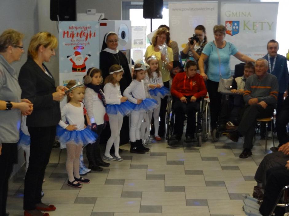 Uroczystości Mikołajkowe rozpoczęły się od uroczystego powitania uczestników i zaproszonych gości Starostwo Powiatowe w Oświęcimiu reprezentował Wicestarosta Jarosław Jurzak, naszą szkołę reprezentowali Dyrektor Specjalnego Ośrodka Szkolno – Wychowawczego Jacek Polak i Dyrektor Szkoły Przysposabiającej do Pracy pani Renata Boba. Następnie obejrzano program artystyczny, na który składały się występy jasełkowe dzieci z Publicznego Przedszkola Sióstr Zmartwychwstanek w Kętach.