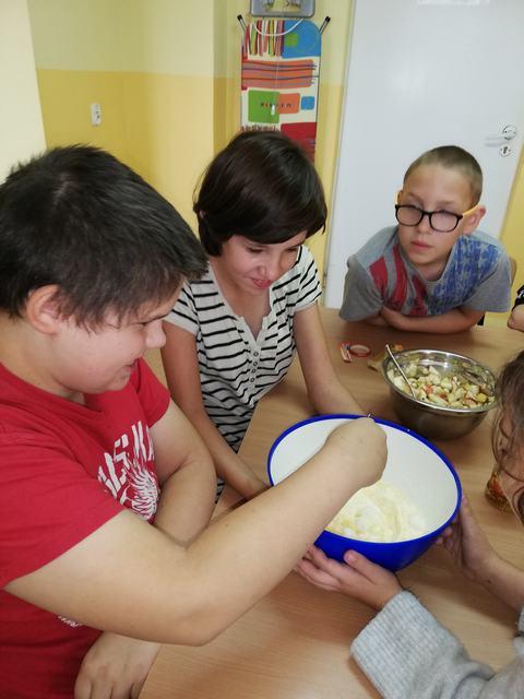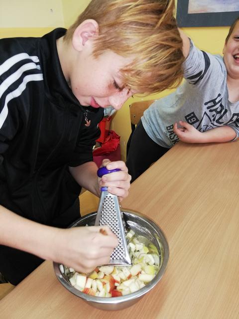 Uczniowie klasy 4a i 5a po zapoznaniu się z wartościami odżywczymi jabłek i ich znaczeniem dla zdrowia organizmu, postanowili upiec zdrowe, niskokaloryczne ciasto z jabłkami. Przed przystąpieniem do pracy utrwalili zasady BHP podczas pracy z urządzeniami elektrycznymi w kuchni oraz zasady higieny podczas pracy