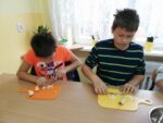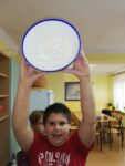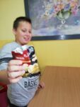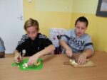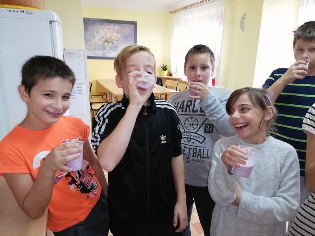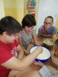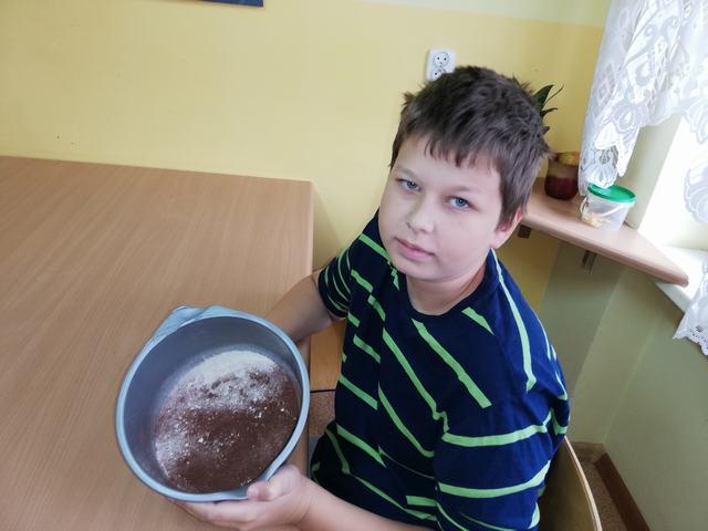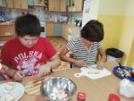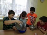 z produktami spożywczymi. Do przygotowania ciasta uczniowie użyli mąkę owsianą, kakao, jajka , miód oraz przyprawy cynamon i imbir. Wszyscy z zapałem kroili, mieszali, ubijali pianę z białek. Do deseru uczniowie przygotowali pyszny koktajl z maślanki i borówek, dosłodzony oczywiście miodem.