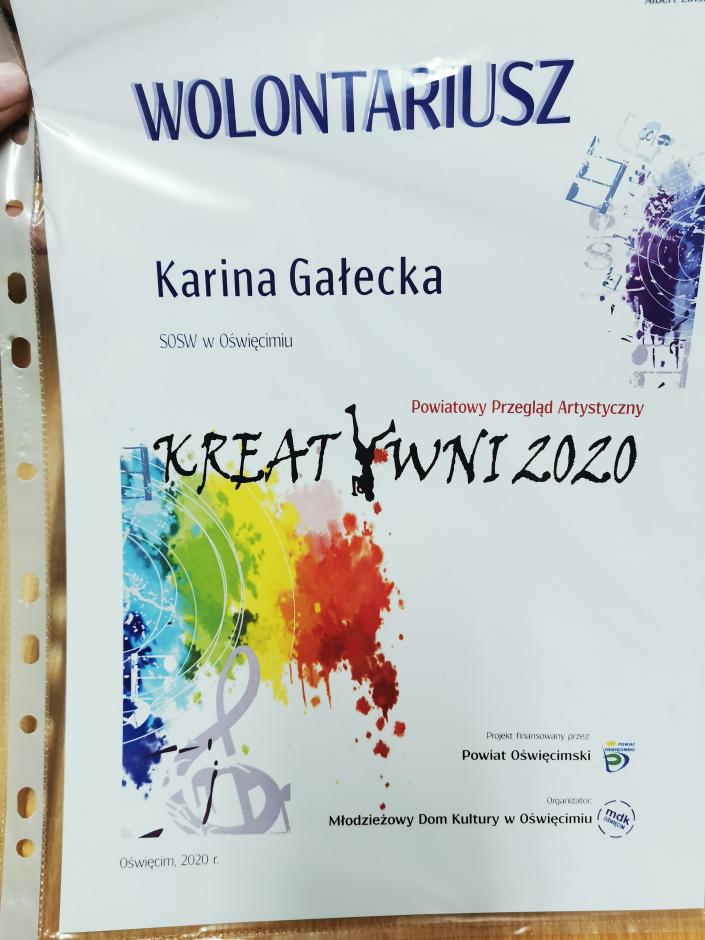 Organizatorem przeglądu był Młodzieżowy Dom Kultury w Oświęcimiu. Projekt sfinansował Powiat Oświęcimski. Uczennica naszej szkoły – Karina otrzymała wyróżnienie! W Jej ręce trafił pamiątkowy dyplom oraz bon pieniężny.