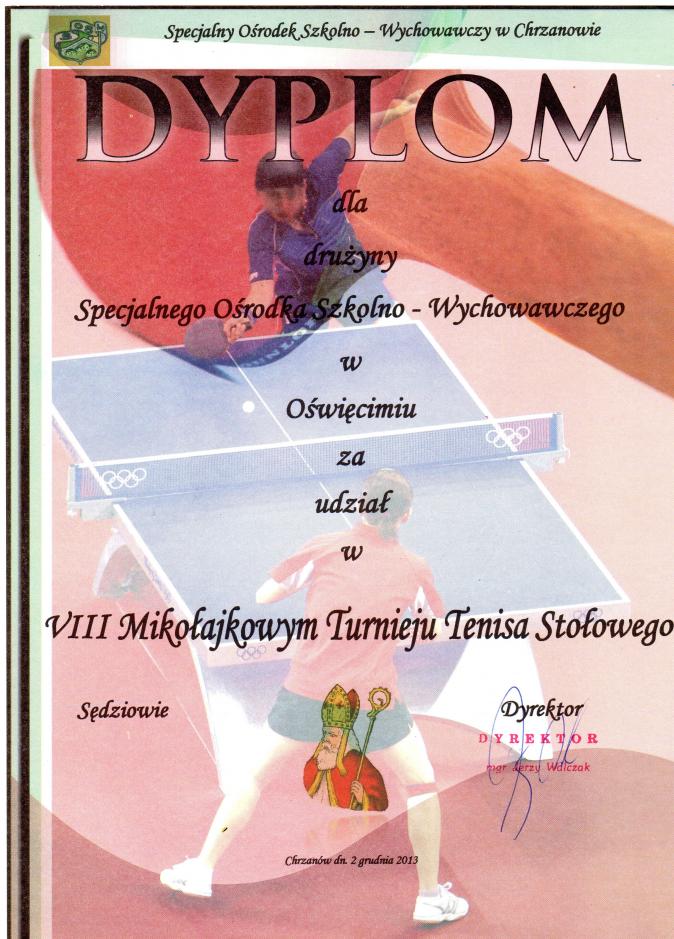W dniu 2 grudnia nasza sportowa ekipa, kolejny raz brała udział w zawodach sportowych. Tym razem był to VIII MIKOŁAJKOWY TURNIEJ TENISA STOŁOWEGO w Chrzanowie. Naszą szkołę reprezentowali: Jan Szczurek, Jacek Flasz i Kamil Pastuszka. Rywalizacja rozgrywała się na trzech poziomach: podstawowym, średnim i zaawansowanym. Nie było łatwo, mimo to sprostaliśmy wyzwaniu. Nasze wyniki: miejsce VI (JACEK FLASZ), oraz dwa miejsca VII (Kamil Pastuszka i Jan Szczurek).
