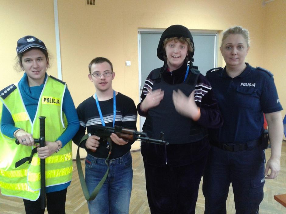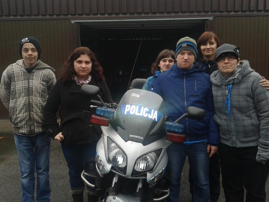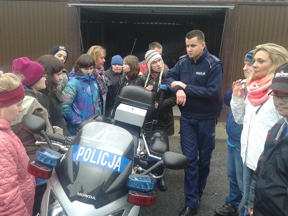 W dniu 22.X pani Sabina zorganizowała dla naszych podopiecznych wyjście do Komendy Powiatowej Policji w Oświęcimiu w celu poznania pracy policji, funkcjonowania wydziału ruchu drogowego oraz wydziału kryminalistyki. Uczniowie zobaczyli od środka jak wygląda radiowóz oraz bliżej przyjrzeli się motocyklowi policyjnemu. Przekonali się, że w budynku komendy istnieje wiele ciekawych pokoi – tych do przesłuchań, do zatrzymań (cel) oraz do rozmów z małoletnimi. Zostaliśmy także zapoznani z technikami pracy kryminalnej (zostały zebrane z naszych rąk ślady linii papilarnych – nazywane potocznie odciskami oraz pokazano nam sprzęt techniczny do zbierania śladów kryminalnych). Mieliśmy też możliwość i ogromną przyjemność założenia na siebie kilku części z podstawowego wyposażenia mundurowego policjanta takich jak kamizelka czy hełm. Zapoznaliśmy się z bronią typu kałasznikow i tonfa. Wizyta mimo, że odbyła się w poważnej instytucji była wizytą miłą, przyjemną i pełną satysfakcji. Przekonaliśmy się, że POLICJA może stać się PRZYJACIELEM 🙂