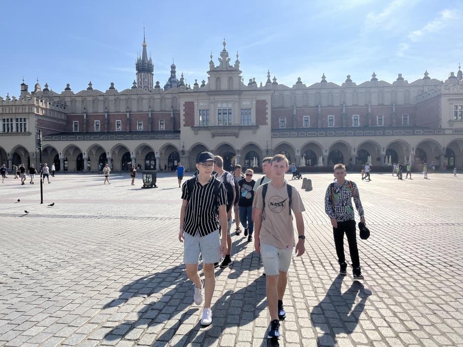 Kontynuując udaliśmy się na wielki rynek krakowski gdzie podziwialiśmy Kościół Mariacki, Sukiennice wypełnione sklepami z fajnymi pamiątkami oraz pomnik słynnego, polskiego poety Adama Mickiewicza. Ostatnią rzeczą o którą zahaczyliśmy, były mury Zamku Królewskiego na Wawelu. Najbardziej zapamiętanym miejscem zostanie dla mnie rynek krakowski.