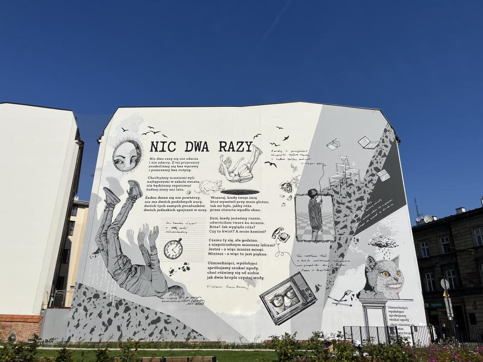 Mi najbardziej podobał się Park Wisławy Szymborskiej, w którym zobaczyłem mural ze słowami wiersza „Nic dwa razy się nie zdarza…” Pomimo zmęczenia po długim chodzeniu bardzo chętnie wybrałbym się znowu na taką wycieczkę i zobaczyłbym te super miejsca.
