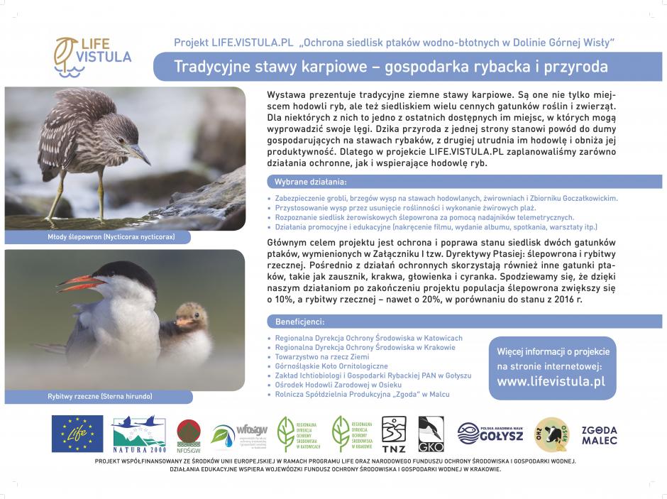 Dzika przyroda z jednej strony stanowi powód do dumy gospodarujących na stawach rybaków, z drugiej utrudnia im hodowlę i obniża jej produktywność. Dlatego w projekcie LIFE.VISTULA.PL, którego wystawa jest częścią edukacyjną, zaplanowano zarówno działania ochronne, jak i wspierające hodowlę ryb.