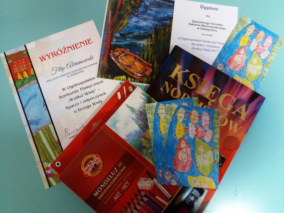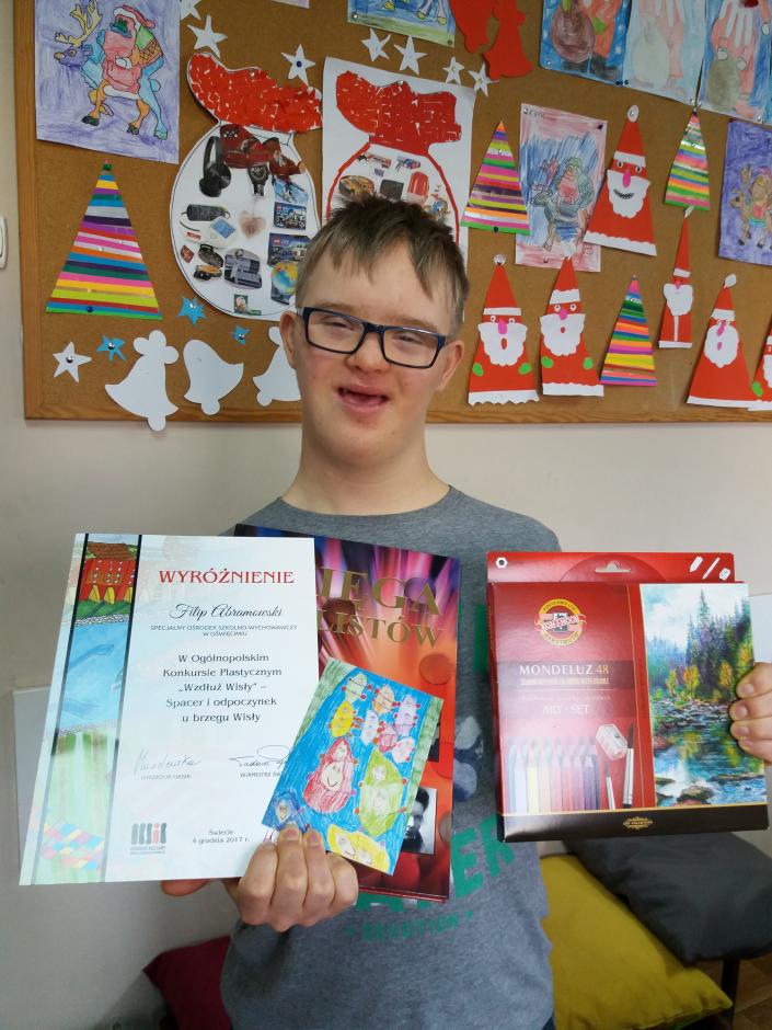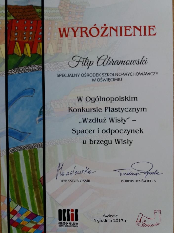 Uczniowie naszej Szkoły wzięli udział w Ogólnopolskim Konkursie Plastycznym organizowanym przez Ośrodek Kultury, Sportu i Rekreacji w Świeciu. Zadaniem konkursowym było wykonanie pracy pt. Spacer i odpoczynek u brzegu Wisły. Na konkurs wpłynęło aż 1123 prace. Filip Abramowski otrzymał wyróżnienie. Serdecznie gratulujemy!