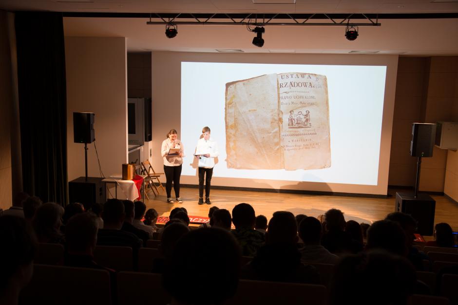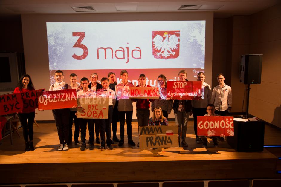 3 maja świętujemy rocznicę uchwalenia najważniejszego dokumentu w naszym państwie, jednym z pierwszych na świecie, którym jest Konstytucja. Z tej okazji uczniowie SPdP i SB wraz z paniami: Agnieszką Pogorzelską, Małgorzatą Dżon i Joanną Gabryszak, przygotowali uroczystą akademię szkolną. Była to dla wszystkich ciekawa lekcja historii w nowoczesnym, patriotycznym wydaniu. Uczniowie zabrali głos w podstawowych kwestiach społecznych wykorzystując do tego przekaz słowny, jak również za pomocą PSC. Nie zabrakło na scenie demonstracji najważniejszych dla każdego człowieka praw, które gwarantuje nam po dzień dzisiejszy właśnie Konstytucja.