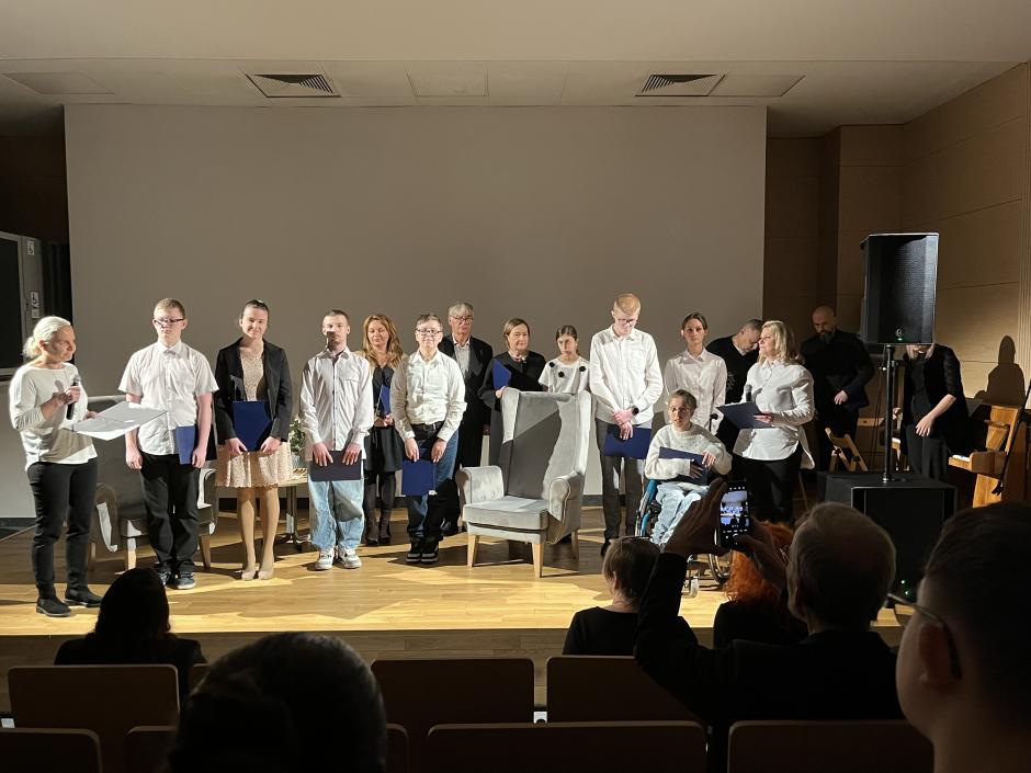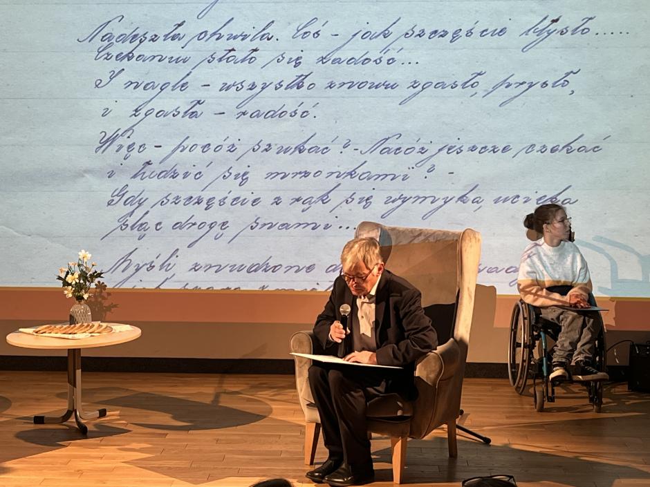 Kilkanaście lat temu Zofia Posmysz przekazała Państwowemu Muzeum Auschwitz w Oświęcimiu zeszyt z wierszami pisanymi w obozie. Bezcenna pamiątka. Tego dnia, skany jej utworów można było zobaczyć w wielkiej grafice na ściance sceny. Do czytania wierszy naszej Patronki, obok uczniów i nauczycieli Ośrodka, zostali zaproszeni wyjątkowi goście. Byli to między innymi przedstawiciele władz w Oświęcimiu na czele z panią Teresą Jankowską i Moniką Stalicą oraz dobrze nam znany pan Leszek Szuster, przyjaciel ś.p. Zofii Posmysz. Na uroczystość przybyli również wicedyrektor Muzeum Auschwitz oraz kierownik archiwum, dyrekcja Międzynarodowego Domu Spotkań Młodzieży w Oświęcimiu, przyjaciółka pani Zofii oraz wielu innych. Obok uczniów Szkoły Podstawowej, utwory pani Zofii czytali ze Szkoły Branżowej Gabriel Cz., Gabriela O., Jakub G. oraz Krzysztof F.