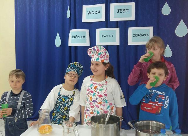 W dniu 13 marca w jadalni szkolnej przygotowano stoisko z wodą, nad którym opiekę sprawowali przedstawiciele klasy 2b Szkoły Podstawowej. Młodzi uczniowie częstowali swoich kolegów i koleżanki wodą niegazowaną oraz wodami smakowymi, które zostały wcześniej przygotowane z naturalnych owoców: cytryn i pomarańczy. Akcja pod hasłem „Woda jest źródłem życia i zdrowia” miała na celu zachęcenie uczniów do zmiany złego nawyku spożywania kolorowych, gazowanych napojów na rzecz czystej, niegazowanej wody mineralnej.